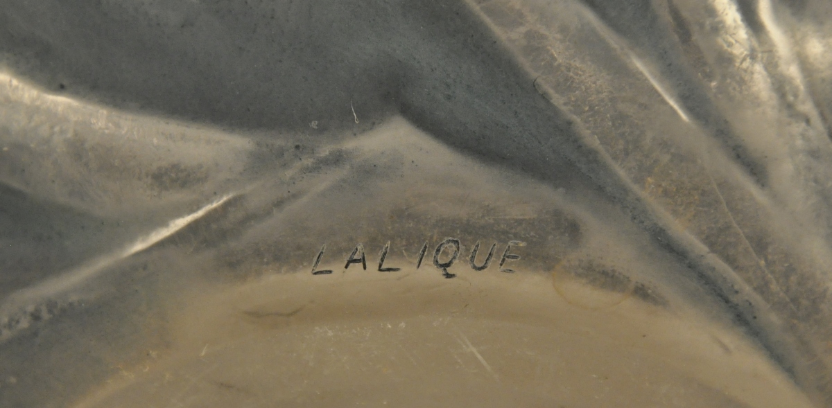 LALIQUE. VASE "Sauterelles" en verre soufflé-moulé à patine bleu-gris. Signé LALIQUE en lettres capitales gravées sur la base.
