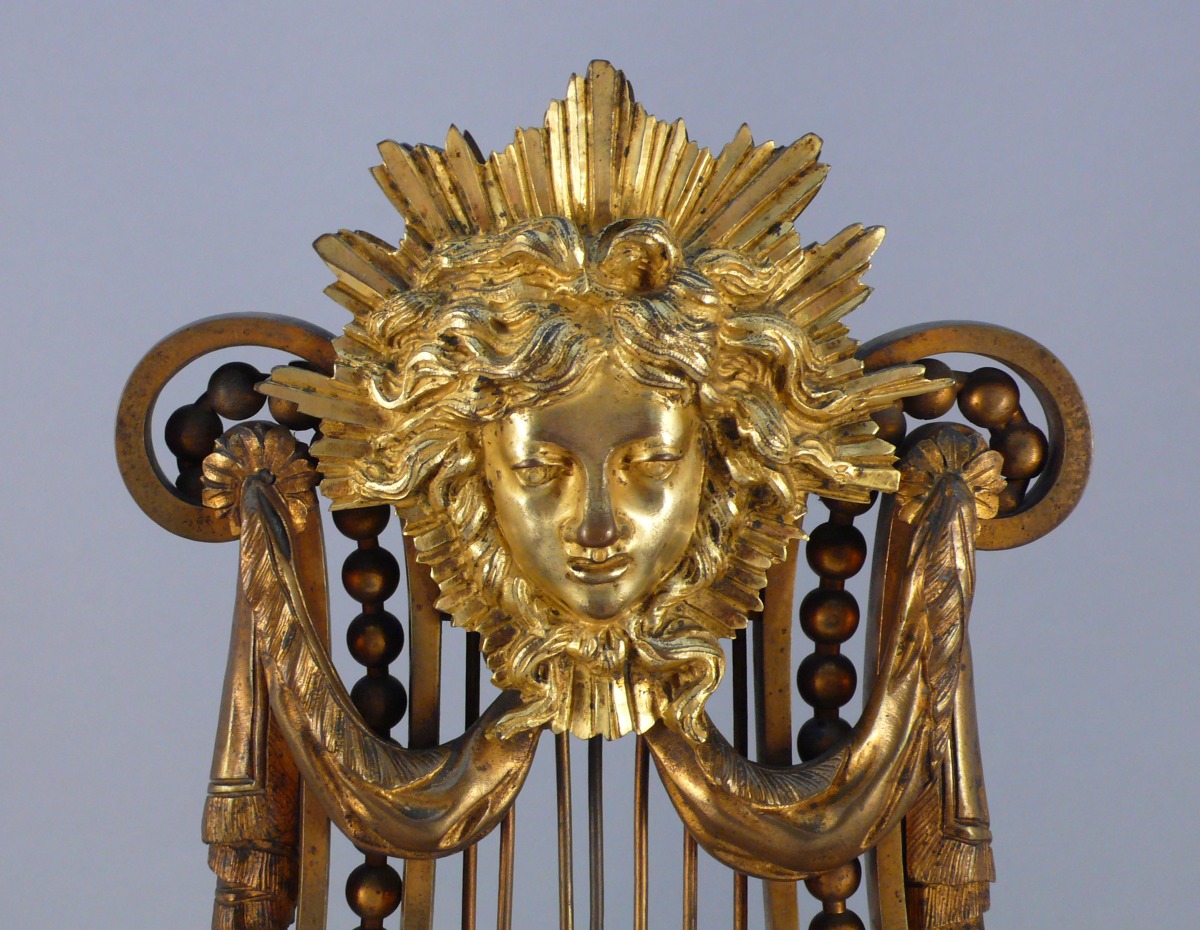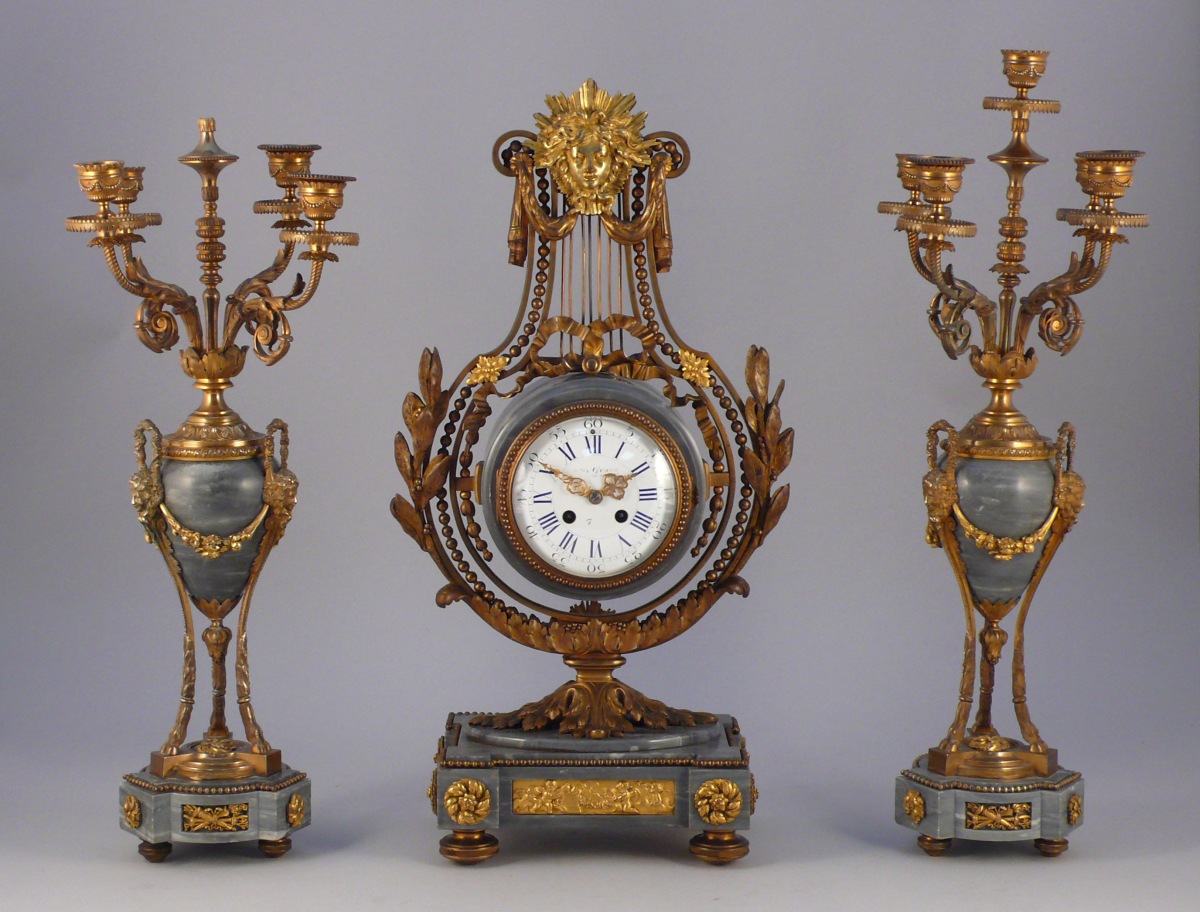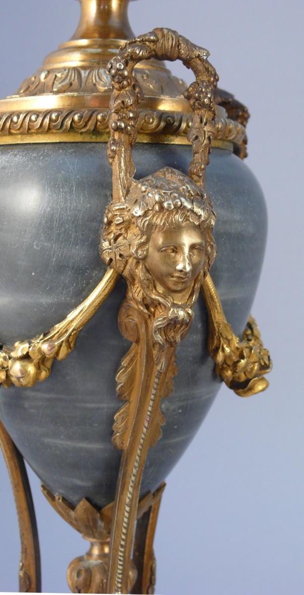 GARNITURE de cheminée en bronze ciselé partiellement doré et marbre Turquin comprenant une pendule lyre et une paire de candélabres. Le cadran, signé "Graux" est émaillé blanc à chiffres romains. Flanqué d'un décor de ruban, rangs de perles et couronnes de lauriers et, sommé d'un masque rayonnant dans des draperies, il repose sur un piédouche à décor de feuilles d'acanthes. La base rectangulaire, à décor de macarons feuillagés et d'un bas-relief figurant des puttis, est terminée par des pieds toupies. Les candélabres, à quatre bras de lumières en volutes feuillagées, figurent des cassolettes à décor de masques coiffés de pampres de vignes, formant des anses et liés par des guirlandes fleuries. Elles sont soutenues par des pieds cambrés terminés par des doubles sabots. Une graine et des feuilles de lauriers en décorent l'amortissement. La base triangulaire à décor des carquois repose sur des pieds toupies.