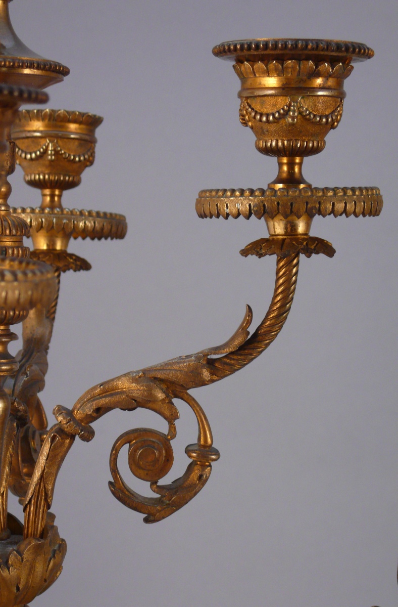 Pendule: Haut. 57,5, Larg. 29; Candélabres: Haut. 54 cm. (manques)