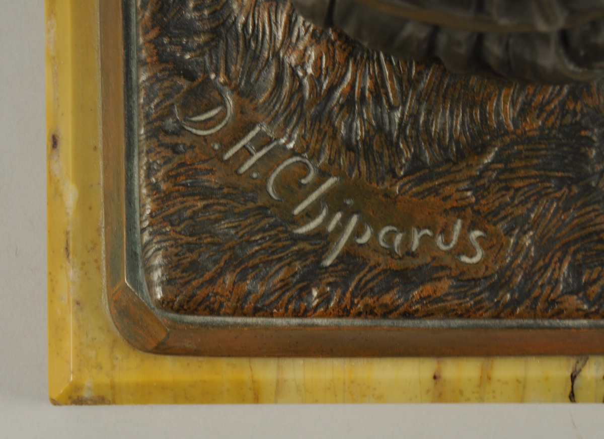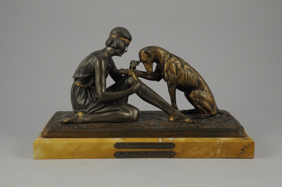 Bronze patiné, signé sur la terrasse. Socle de marbre jaune veiné, portant deux cartels: "Le Personnel de Paris 112 à Monsieur Hapert receveur", "Accident de chasse Par D.H. Chiparus, Salon des Bx Arts".