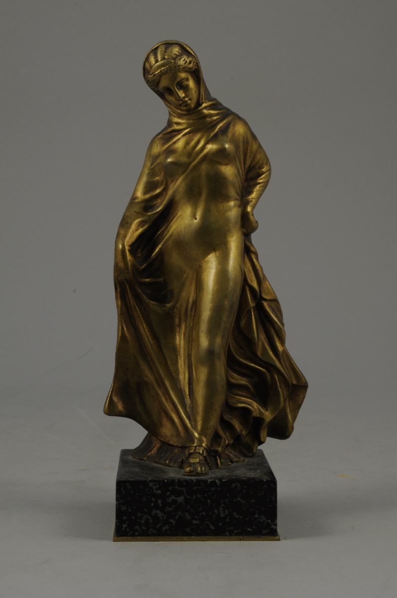 STATUETTE en bronze. Femme drapée à l'antique. Socle de marbre noir et vert, avec cachet de fondeur Thiebaut Frères Paris.
