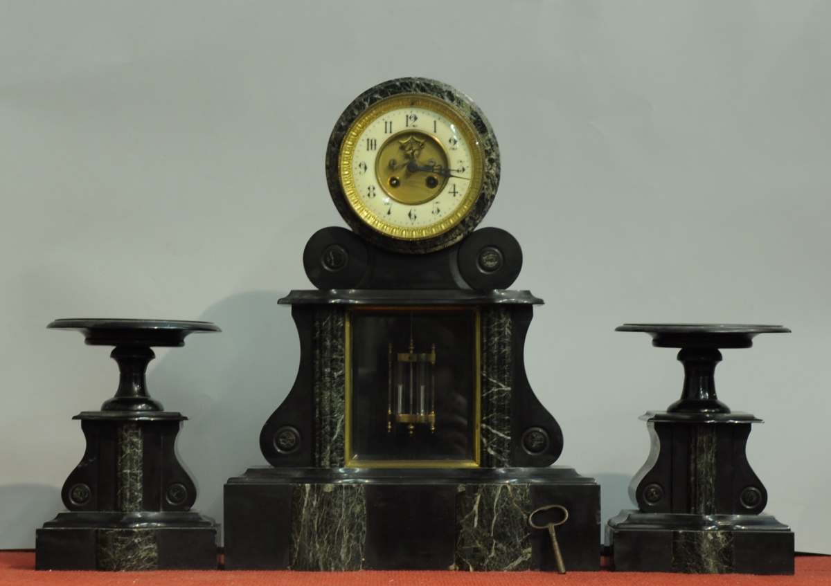 PENDULE BORNE formant garniture de cheminée en marbre noir et vert, avec partie de mécanisme apparent sur le cadran et balancier au mercure. Modèle de JAPY, médaille d'honneur. Fin XIXe, début du XXe siècle. Haut. 48,5 cm. (petits accidents)