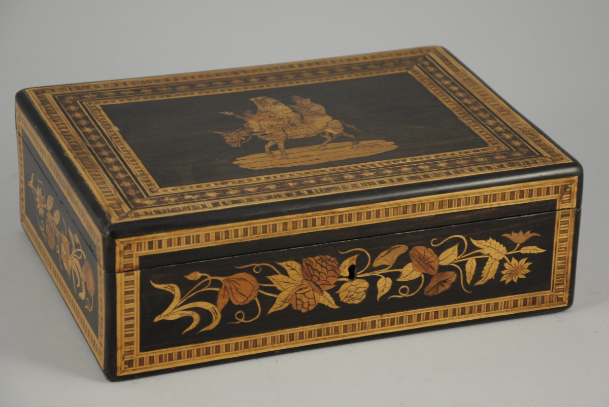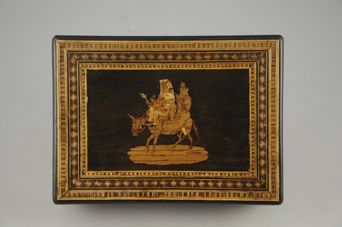 BOîTE à décor marqueté, figurant sur le couvercle un couple et ses trois enfants montés sur un âne. Côtés ornés de guirlandes florales.
