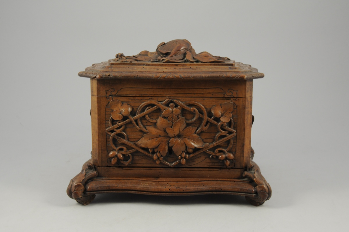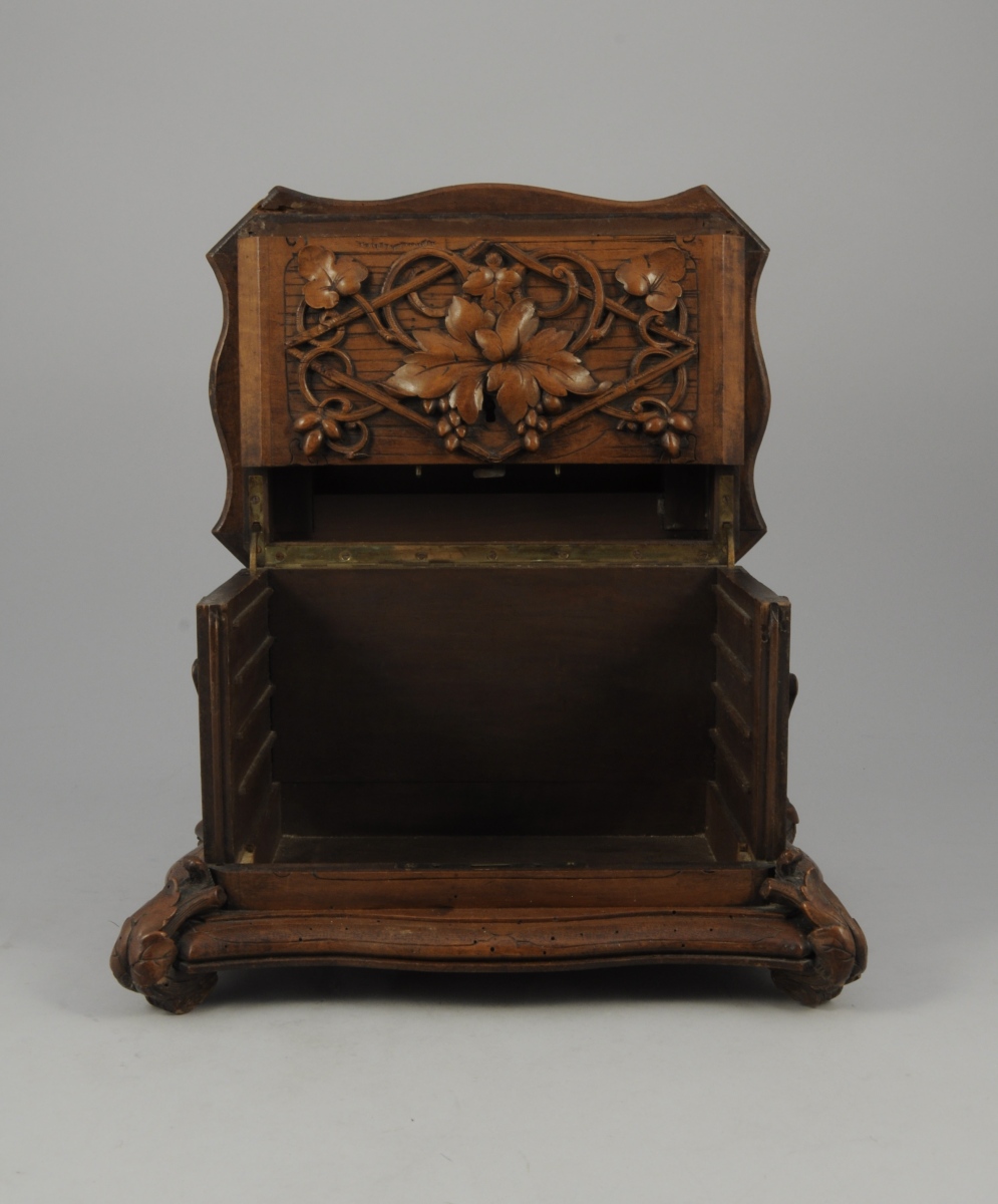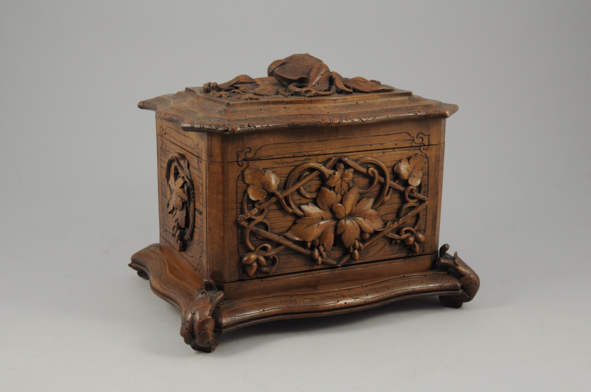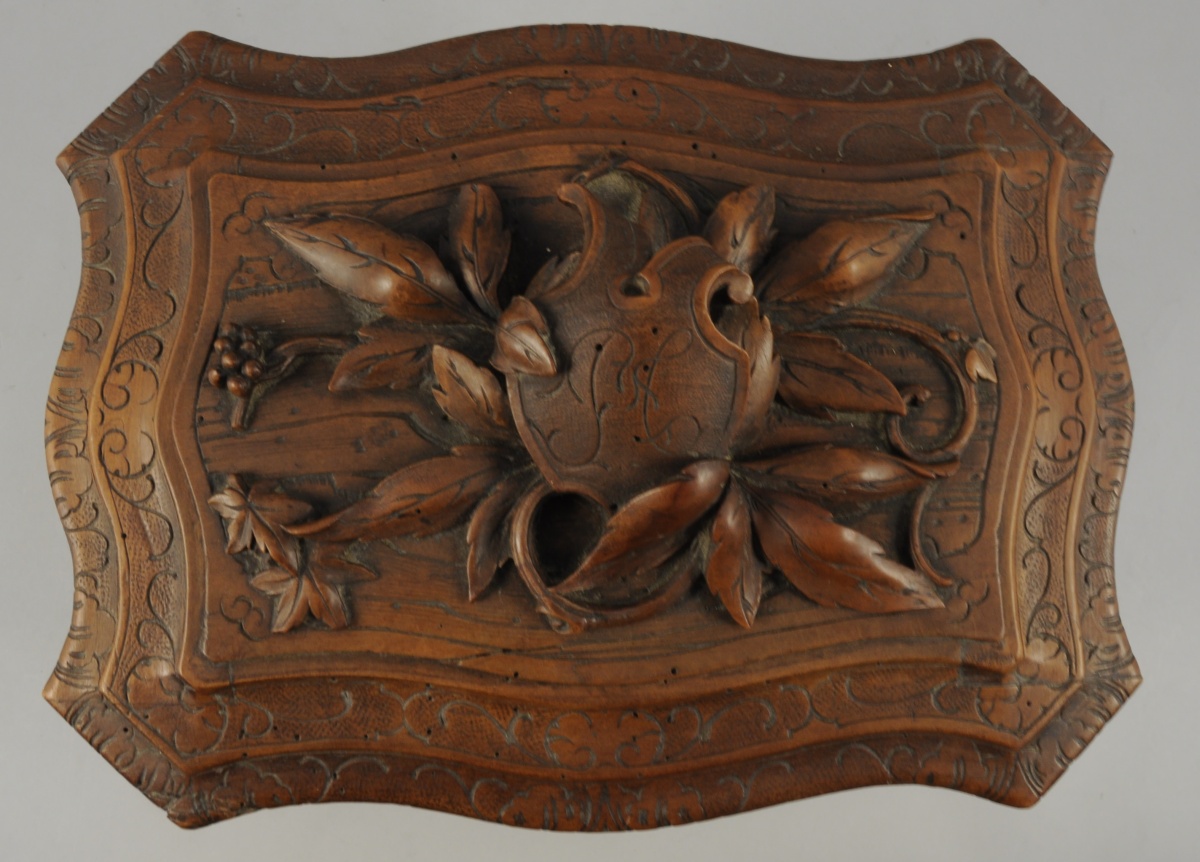 COFFRET en bois sculpté de feuilles de vignes, ouvrant à un battant orné d'un écusson au chiffre "PL", formant boite à cigares. Fin du XIXe. (petits accidents, manque les étagères). 23 x 30 x 22 cm.