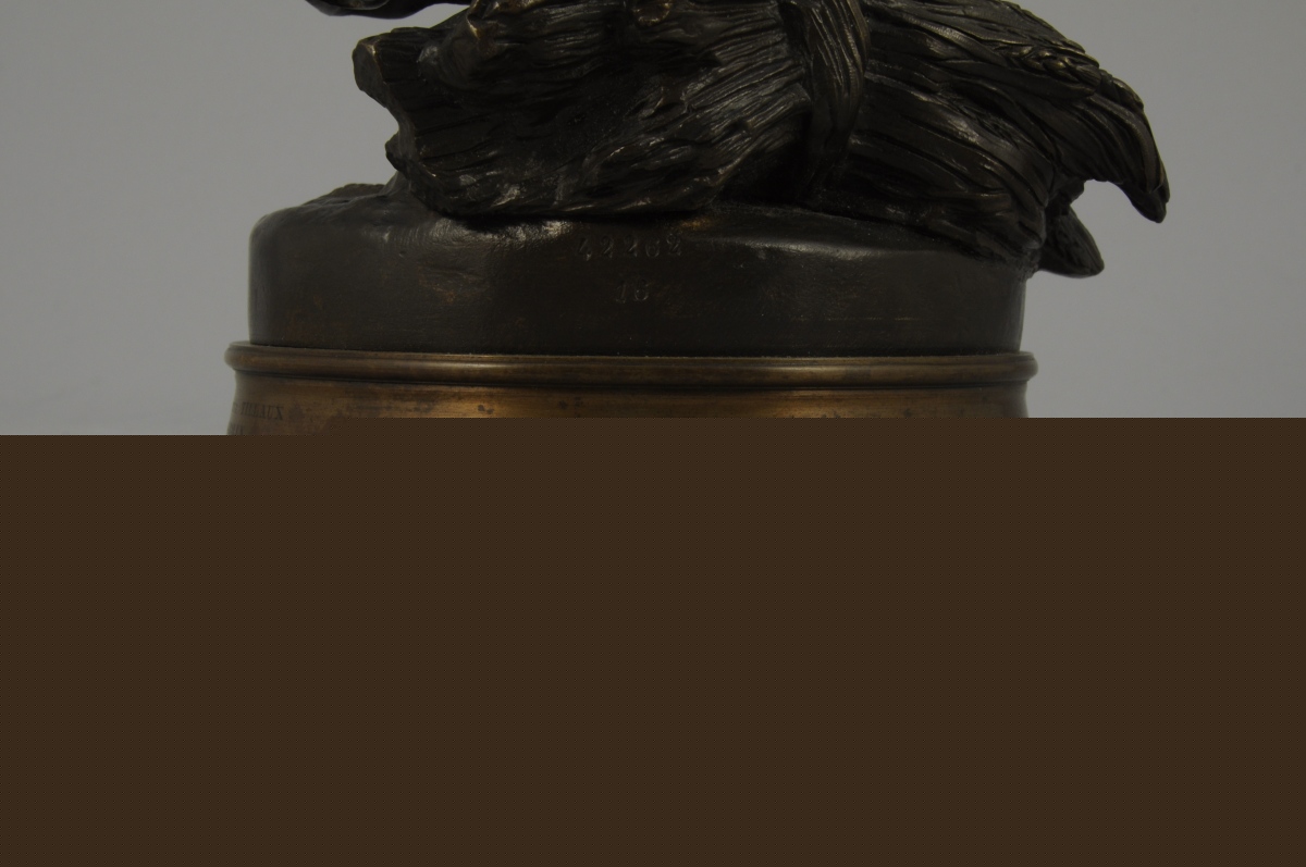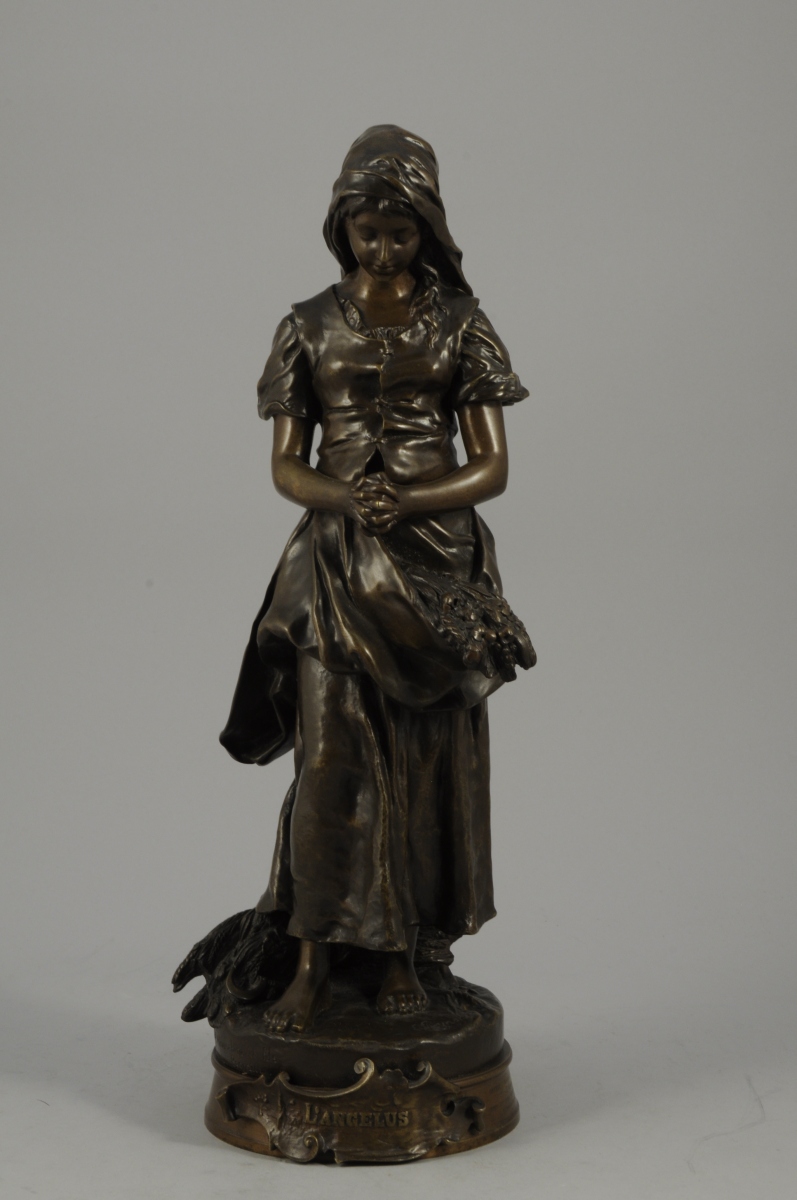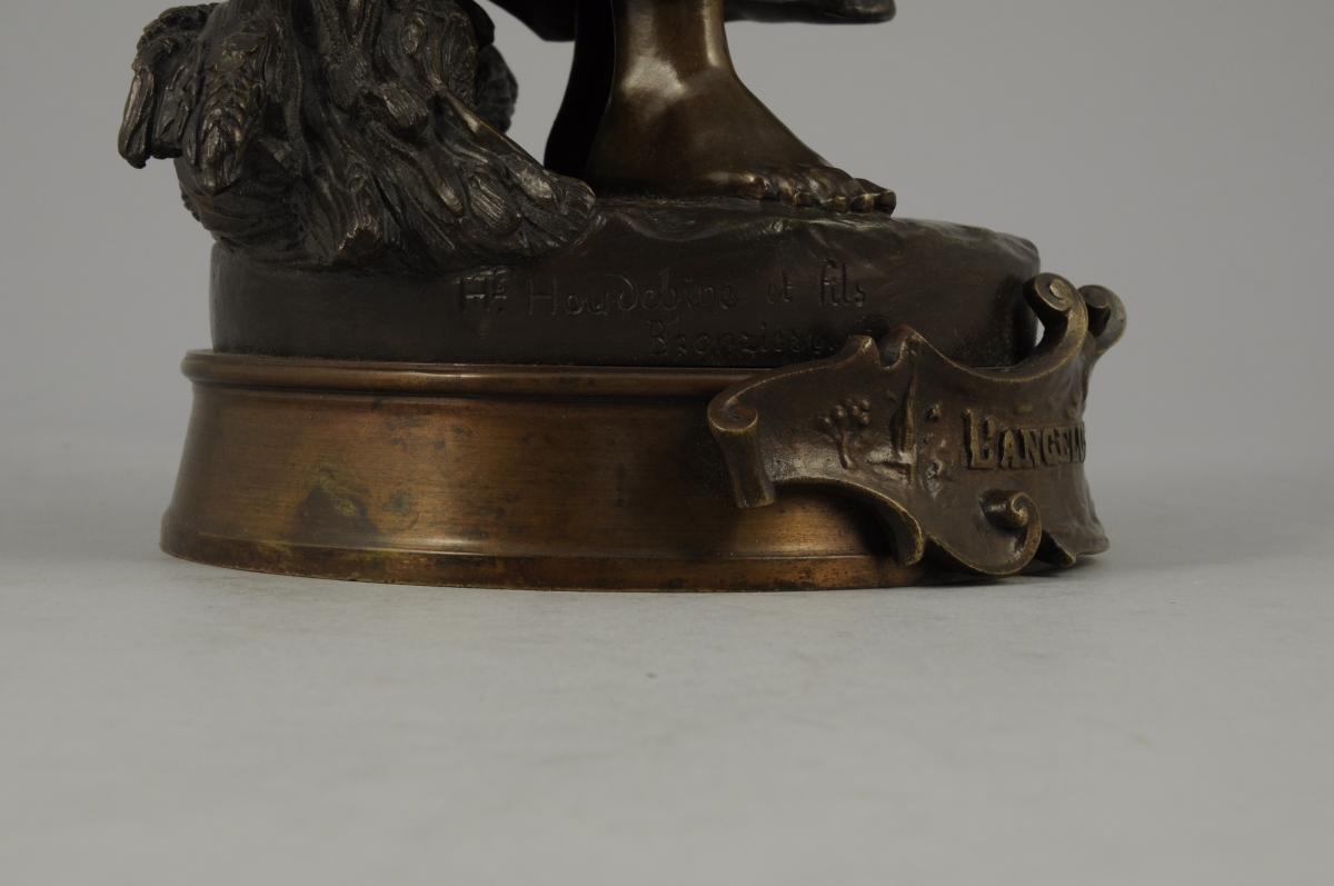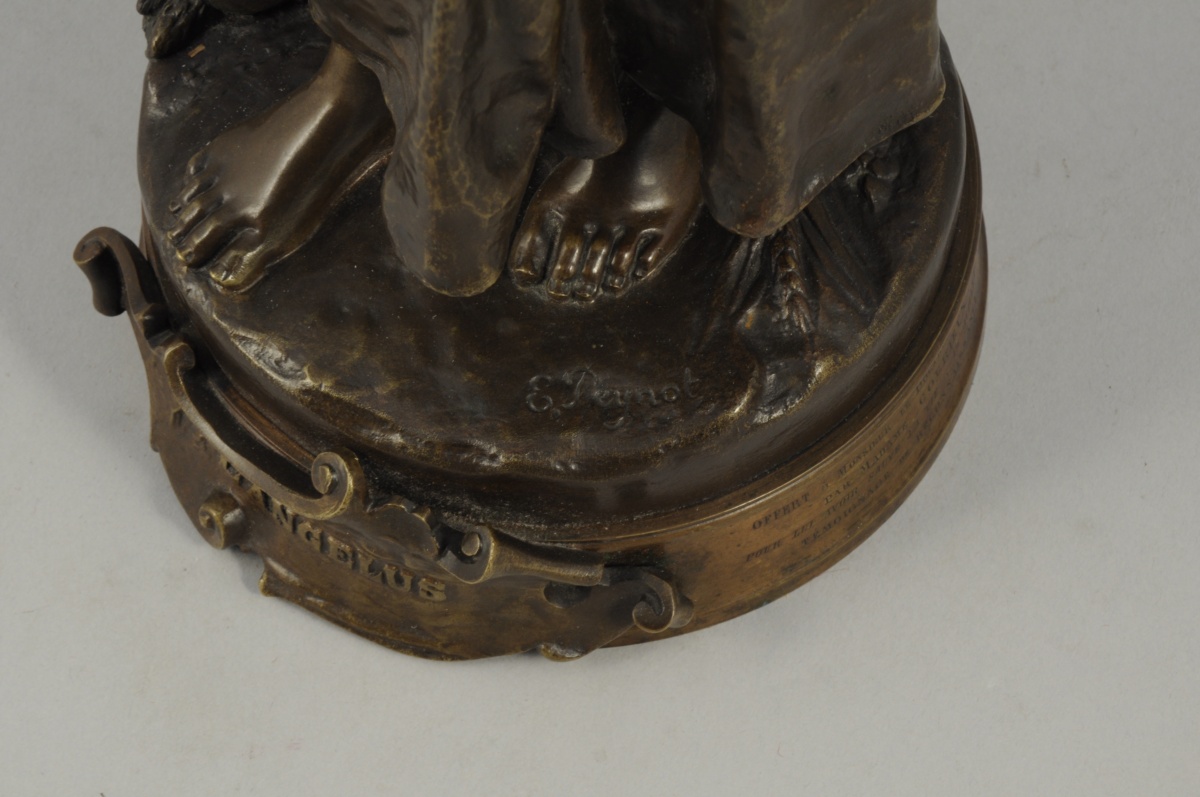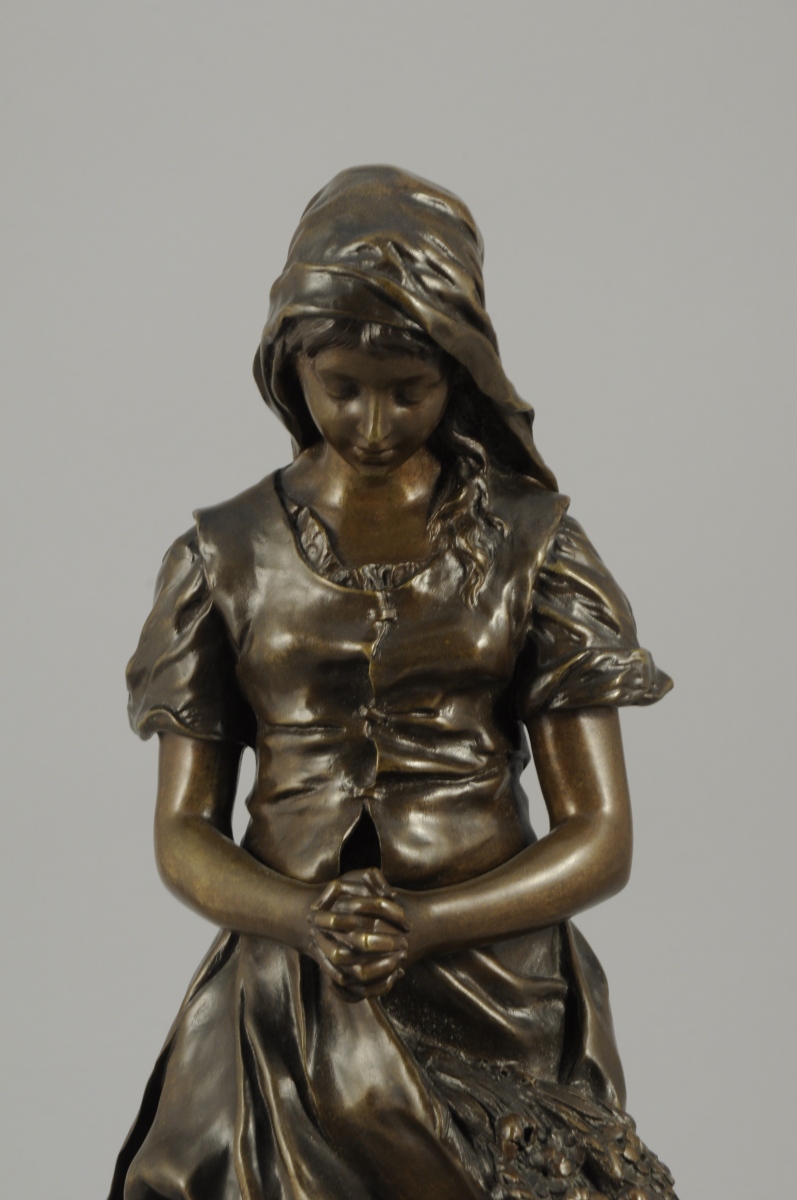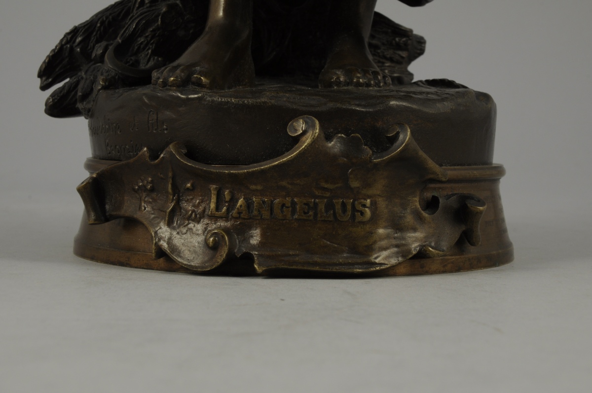 Émile Édmond PEYNOT (1850-1932). "L'angélus". Bronze à patine brune, signé et marqué "Hé Houdebine et Fils / Bronziers", titré sur le socle et gravé "OFFERT à Monsieur le Docteur TILLAUX / par Madame COURTREUX / pour lui avoir sauvé la vie , 19 juillet 1888 / témoignage de reconnaissance".