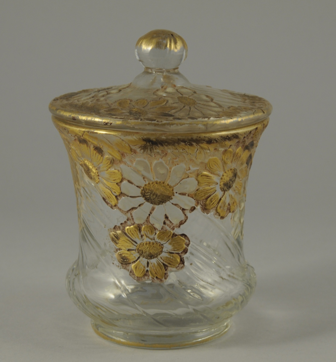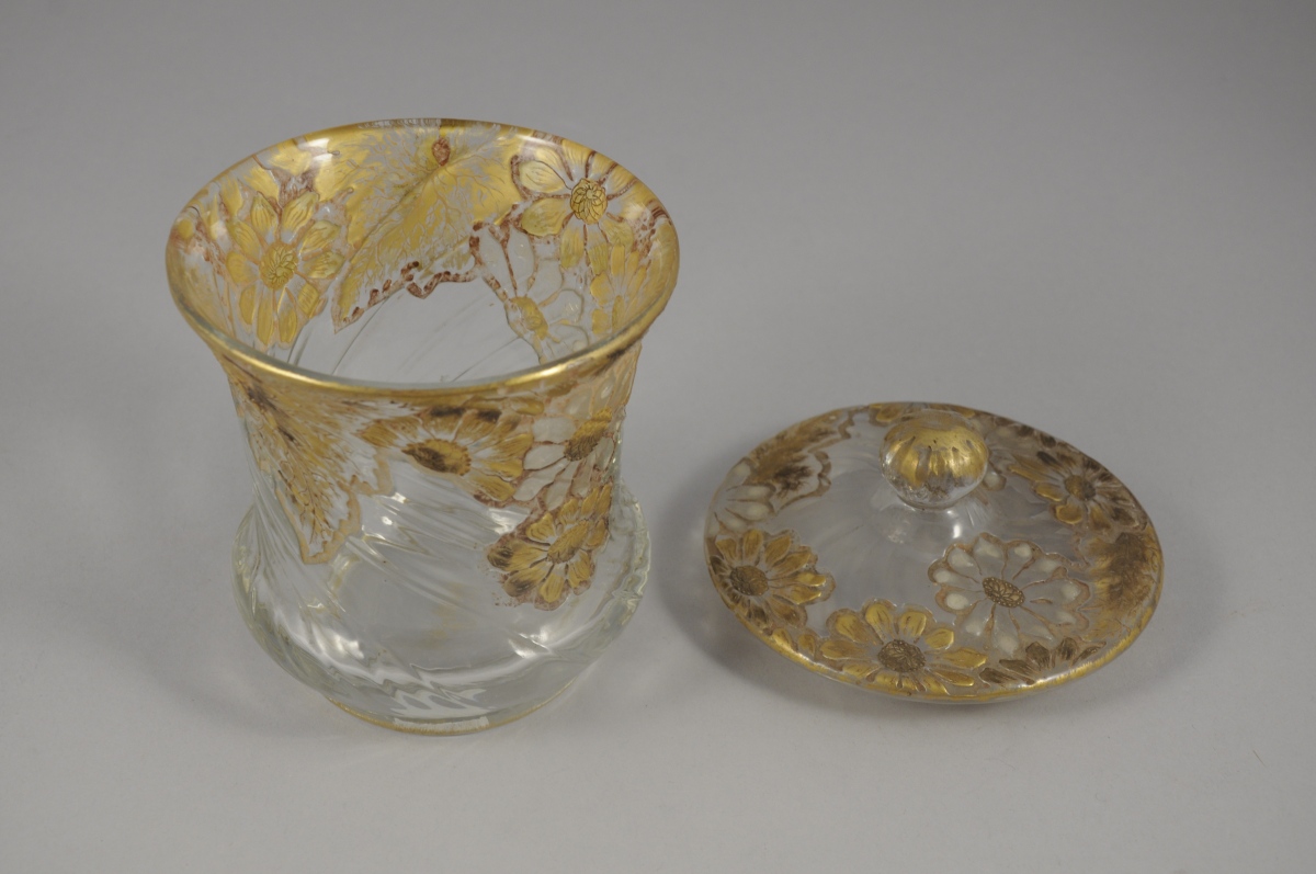 GALLÉ. Pot couvert à renflement en verre torsadé sur piédouche. Décor de marguerites et feuillages dégagés à la meule et rehaussés d'or. Signé au pinceau sous la base.