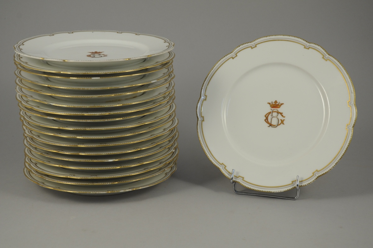 SUITE DE 18 ASSIETTES A DESSERT en porcelaine à aile chantournée à décor d'une frise gris et or. Monogrammé au centre CB, couronne de marquis. Travail de la Maison Ernié, 20 rue Paradis-Poissonnière.