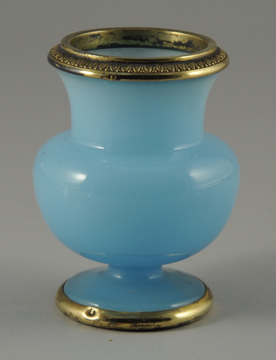 BACCARAT. Petit vase balustre en verre opalin bleu et cerclages de vermeil au col et au piédouche. Signé.