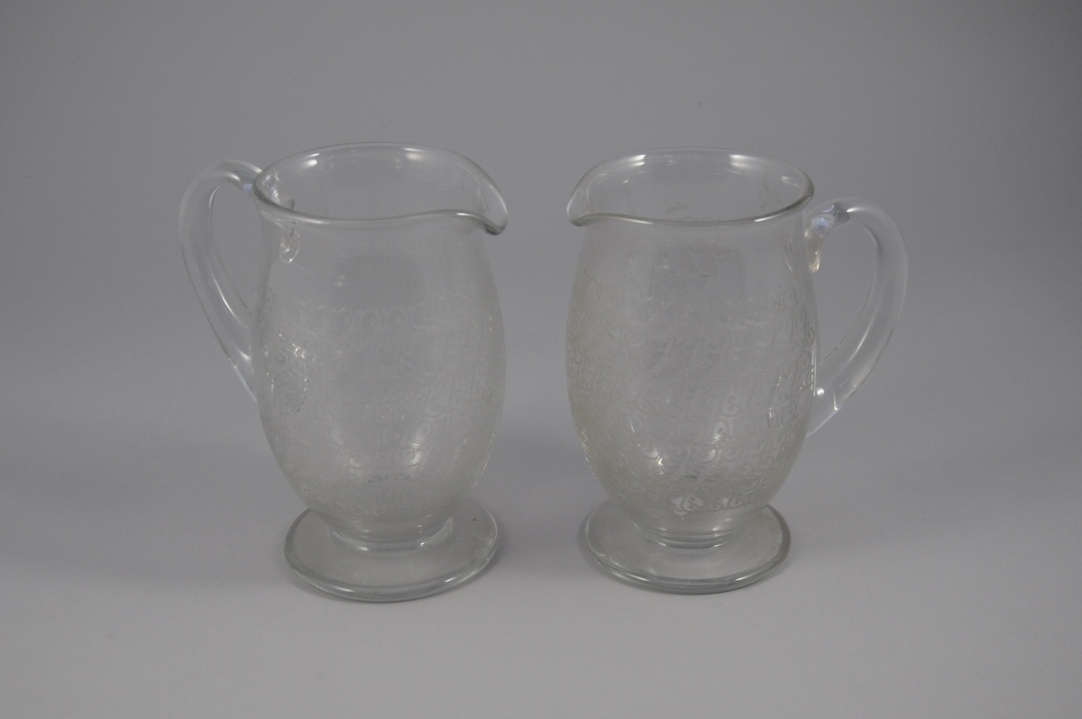 BACCARAT. Paire de pots à eau en verre gravé de rinceaux. Signé.