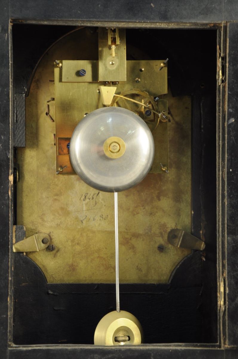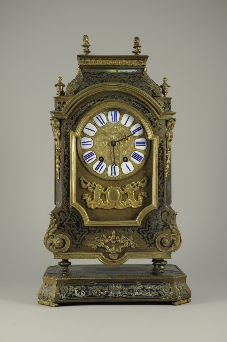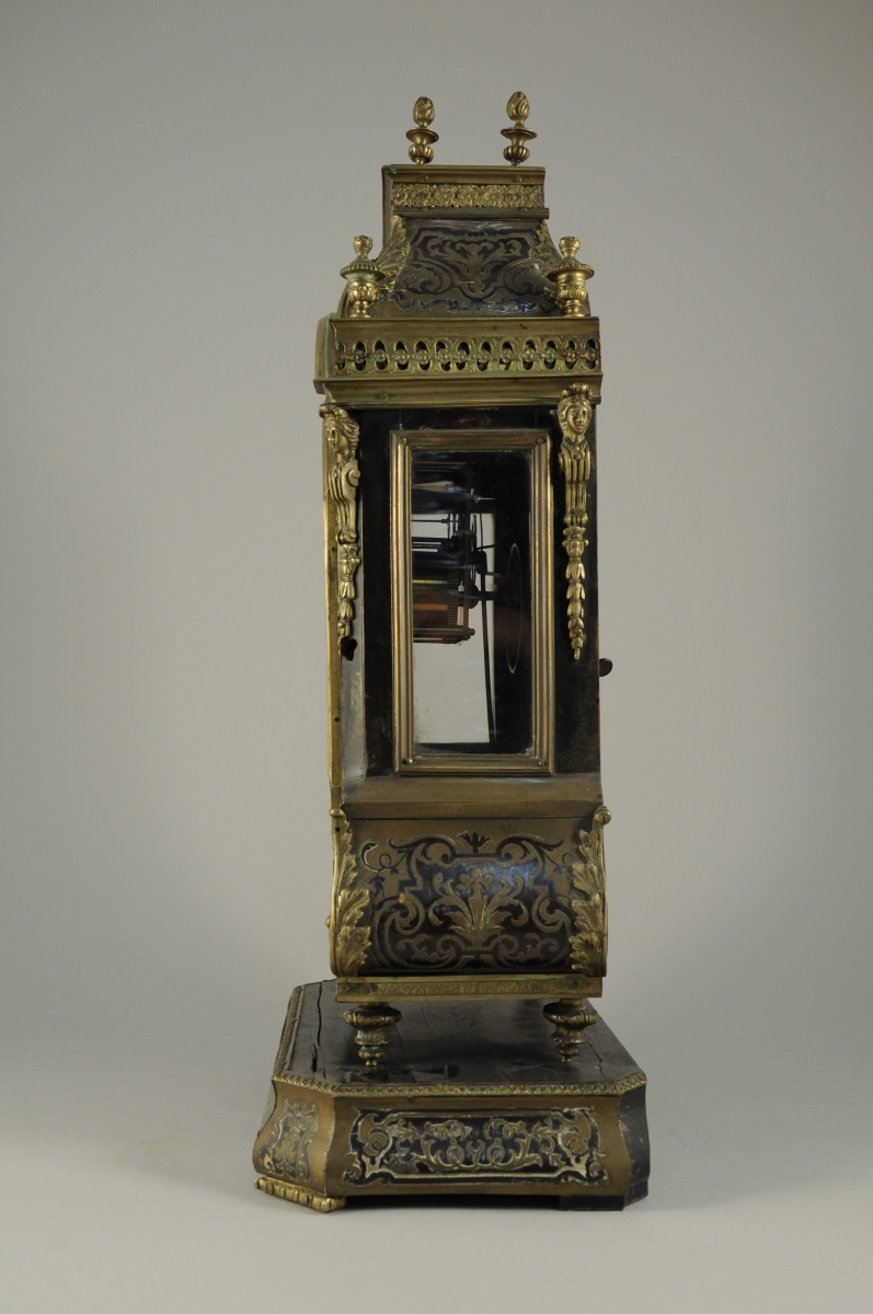 CARTEL à POSER de forme droite et son socle, en bronze, bois noirci et marqueterie dite 'Boulle' de laiton et écaille teintée. Le cadran, aux cartouches des heures émaillés, à décor en laiton ciselé d'entrelacs, volutes feuillagés et de tritons tenant un cartouche. Le fronton à doucine, à décor d'acanthes aux angles et d'une frise de fleurs, est sommé de quatre pots à feu et quatre urnes. Les montants, à pans coupés, sont flanqués de termes en gaine cannelée. Les côtés vitrés. La partie inférieure galbée à motif de volutes d'acanthe est centrée d'un cartouche de branchages et coquille. Il est terminé par des pieds toupies et repose sur un socle en doucine renversée.