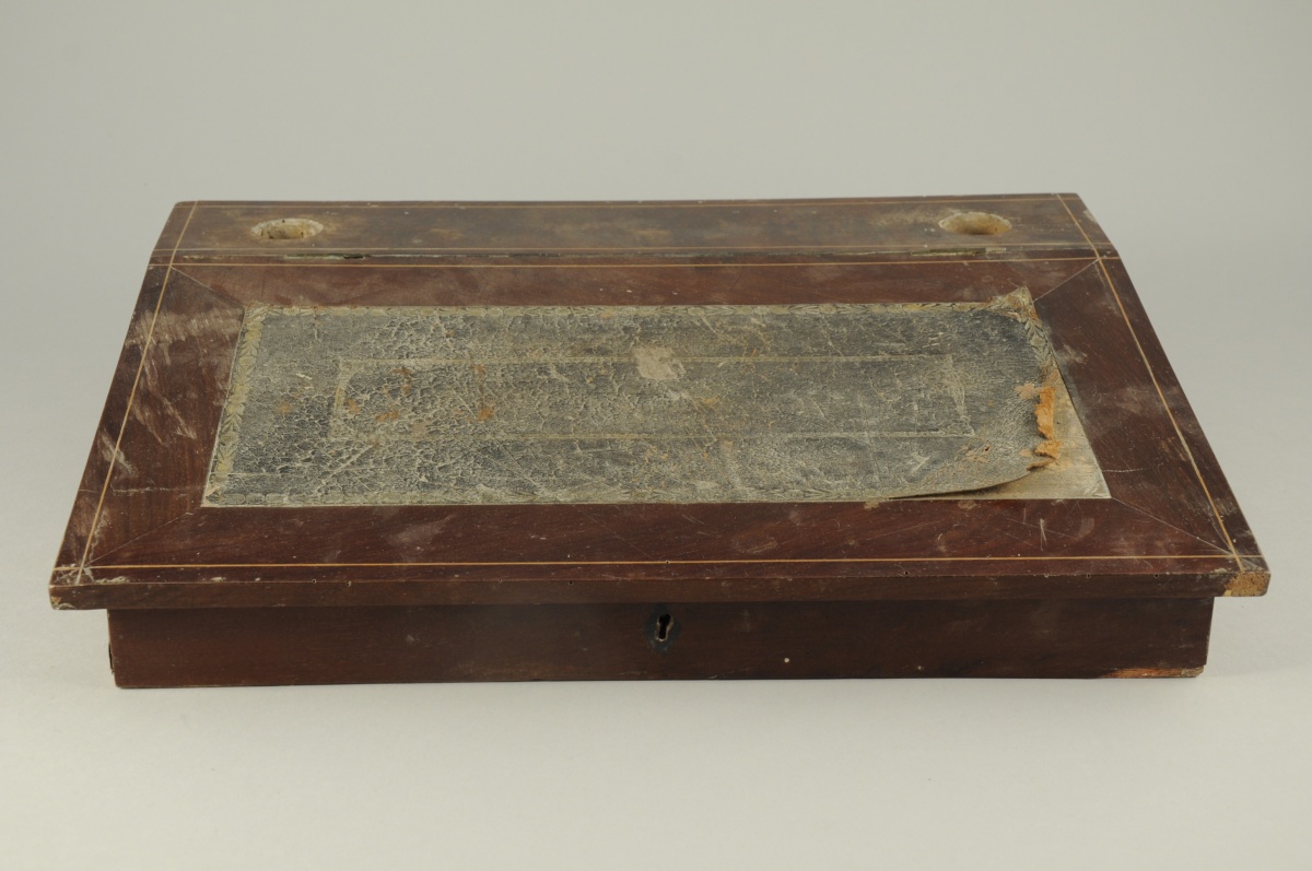 ÉCRITOIRE en placage d'acajou et filets de bois clair. Abattant foncé de cuir à filets dorés.