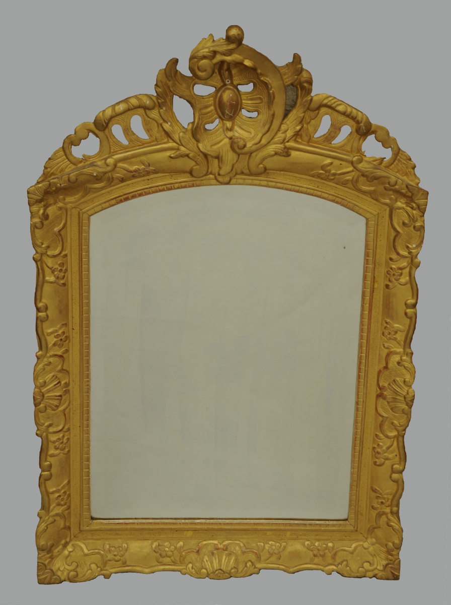 MIROIR en bois sculpté et doré à décor de fleurs et coquilles. Traverse supérieure ajourée à motif d'un cartouche mouvementé de feuilles d'acanthe stylisées.