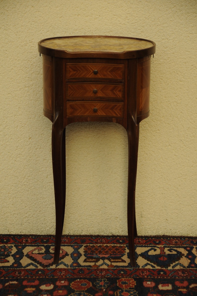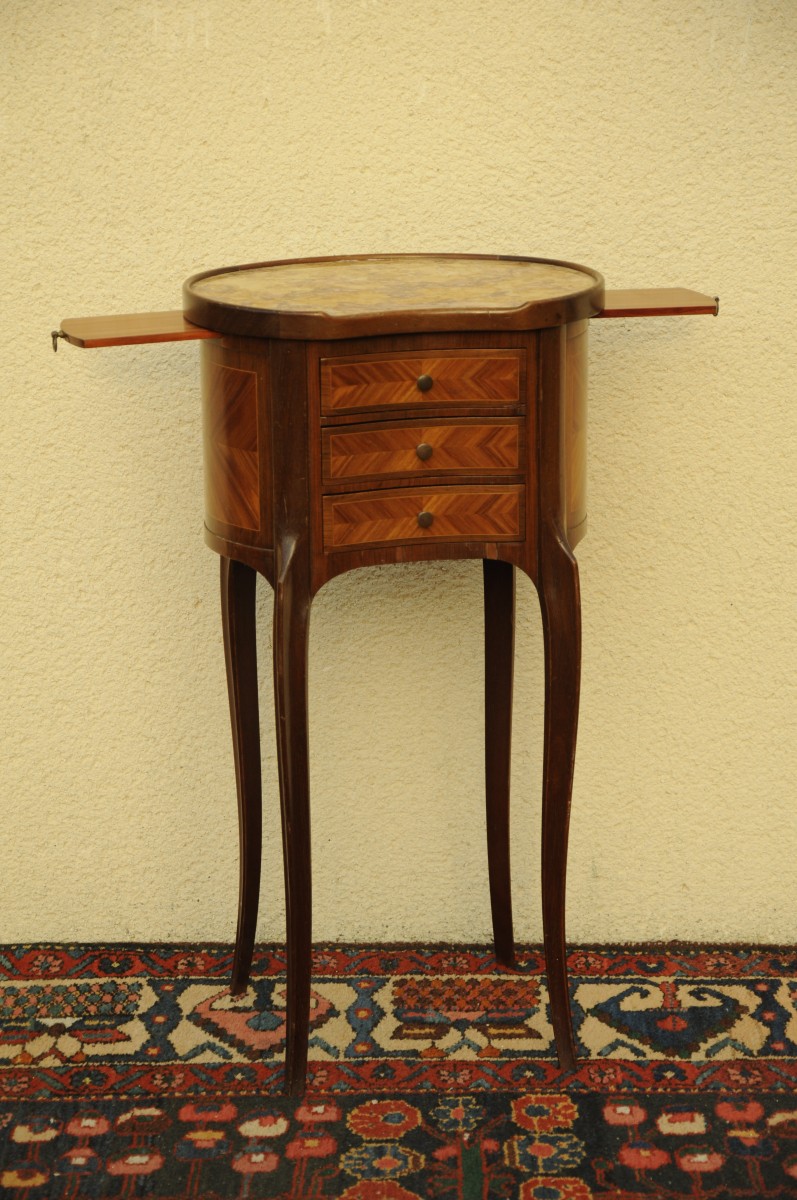 Petite TABLE ROGNON en placage de bois de rose et filets de bois clair. Elle ouvre par trois tiroirs en façade et deux tablettes latérales. Repose sur des pieds cambrés. Dessus de marbre polychrome.