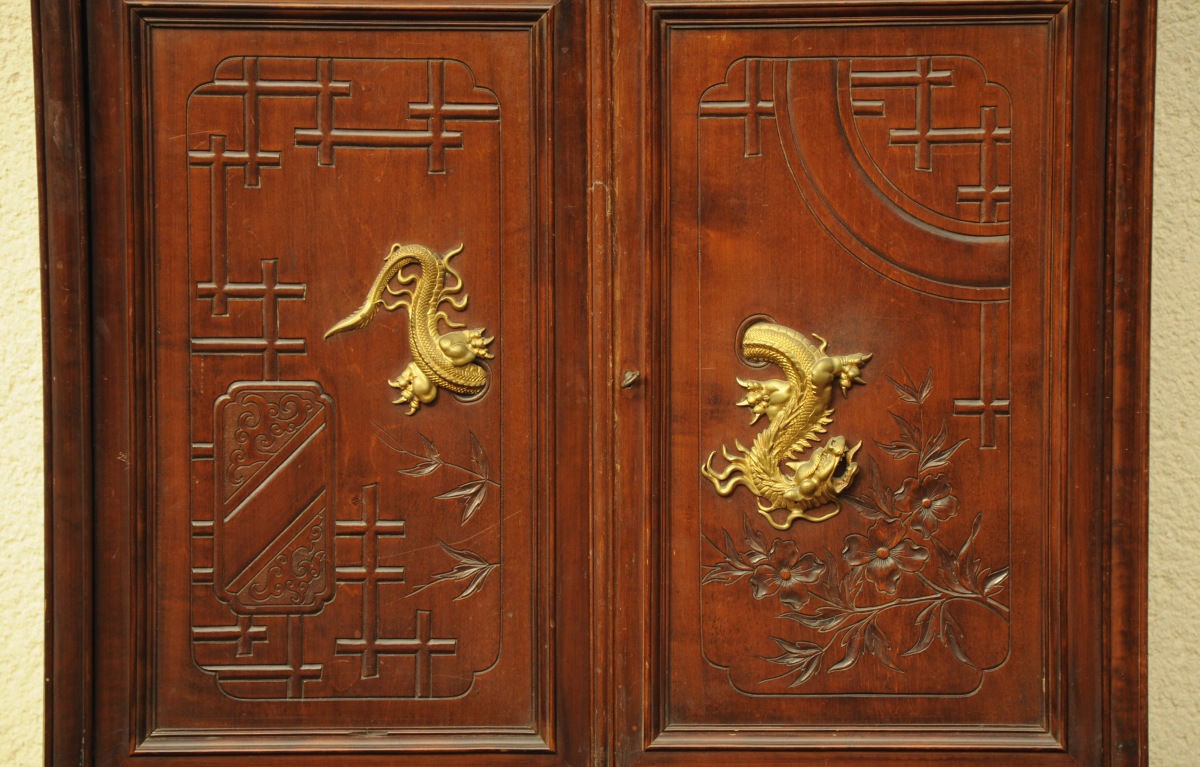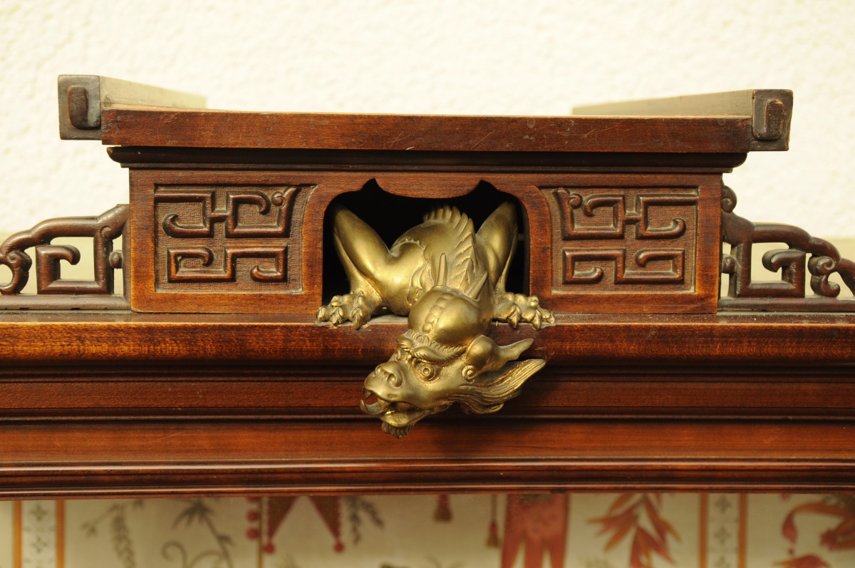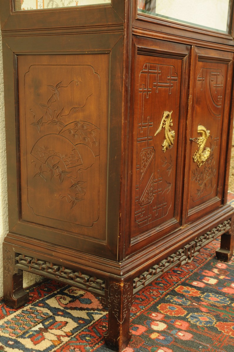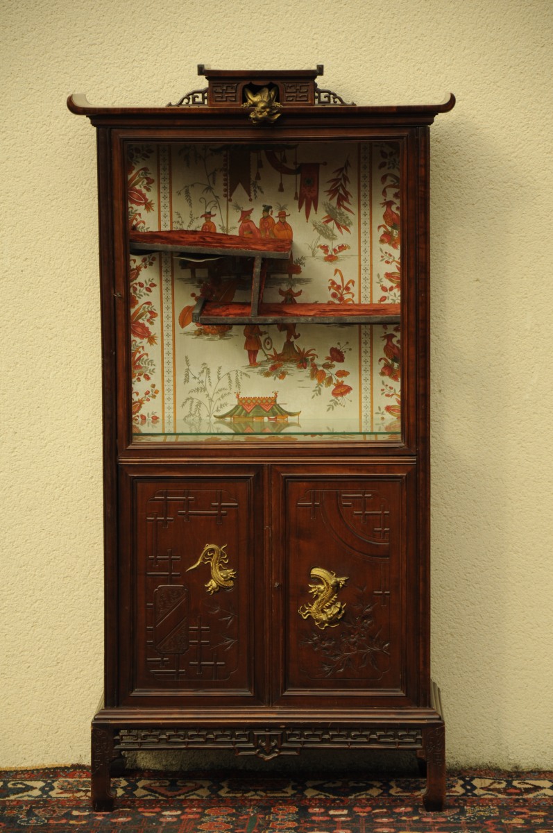 Petite VITRINE verticale en placage d'acajou et bois teinté, mouluré et sculpté. La partie supérieure, garnie d'une étagère à décrochement, est composée d'un vantail et de côtés vitrés. Le fronton, à pagode, est sommé d'un dragon en bronze doré sortant d'une façade flanquée de volutes ajourées. Les étagères foncées de velours rouge cramoisi et le fond de toile de coton à décor aux chinois. La partie basse ouvre par deux vantaux ornés d'un dragon de bronze doré en mouvement dans un décor gravé de fleurs et treillage. Le piétement, décoré d'une frise ajourée à décor de volutes, repose sur des pieds de section carrée courbés vers l'intérieur.