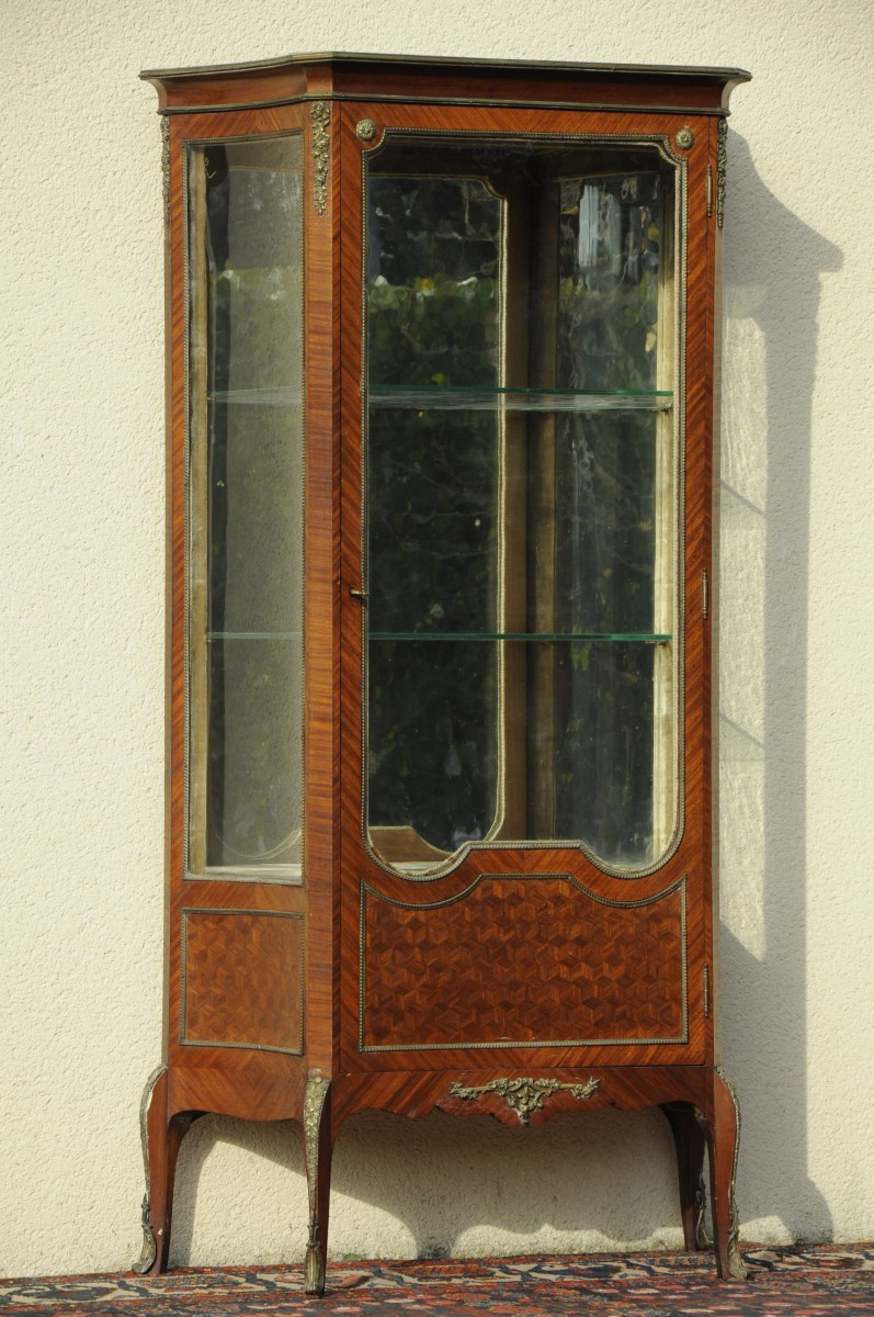 VITRINE en bois de placage et ornementations de bronze ouvrant par une porte vitrée. Les côtés incurvés vitrés et les montants à pans coupés à décor de chutes de fleurs. La corniche évasée et les vitres sont ceintes de baguettes à décor de perles ou raie-de-coeur. Intérieur foncé de velours gris et fond de miroir. La traverse inférieure mouvementée à décor fleuri. Elle repose sur des pieds cambrés à décor de feuilles et terminés par des enroulements.