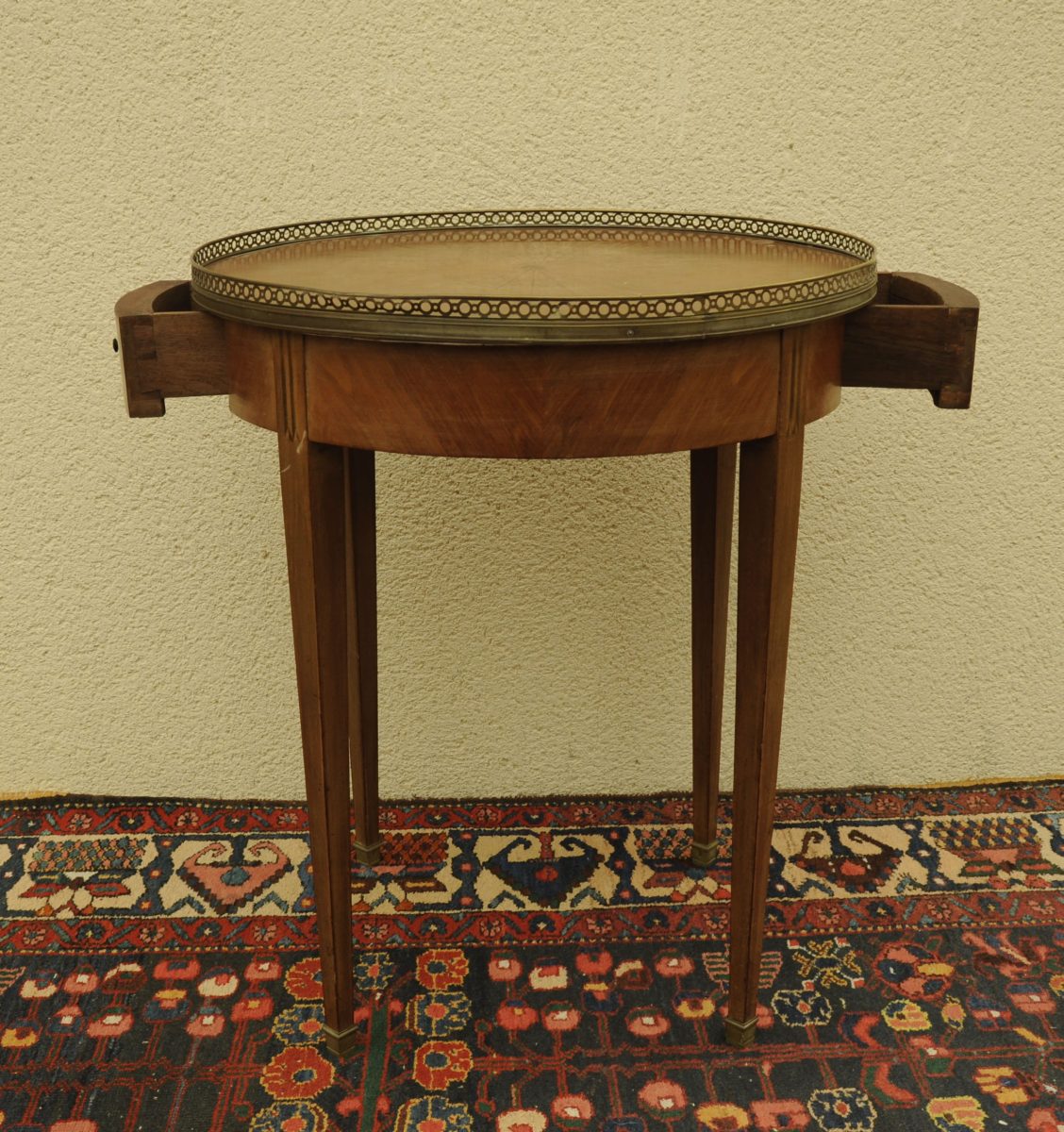 GUÉRIDON circulaire en bois de placage ouvrant par deux tiroirs en ceinture. Le plateau ceint d'une galerie de laiton à décor ajouré d'oves. Il repose sur quatre pieds gaines à décor de cannelures et terminés par des sabots de bronze.
