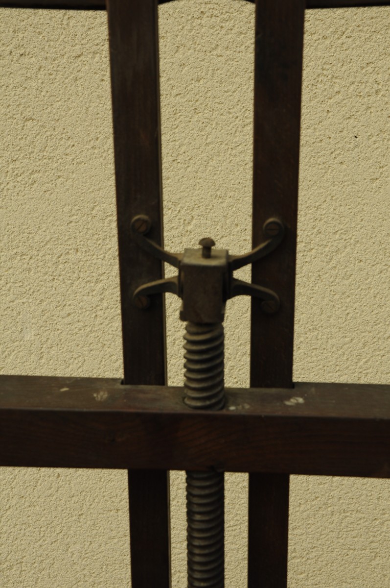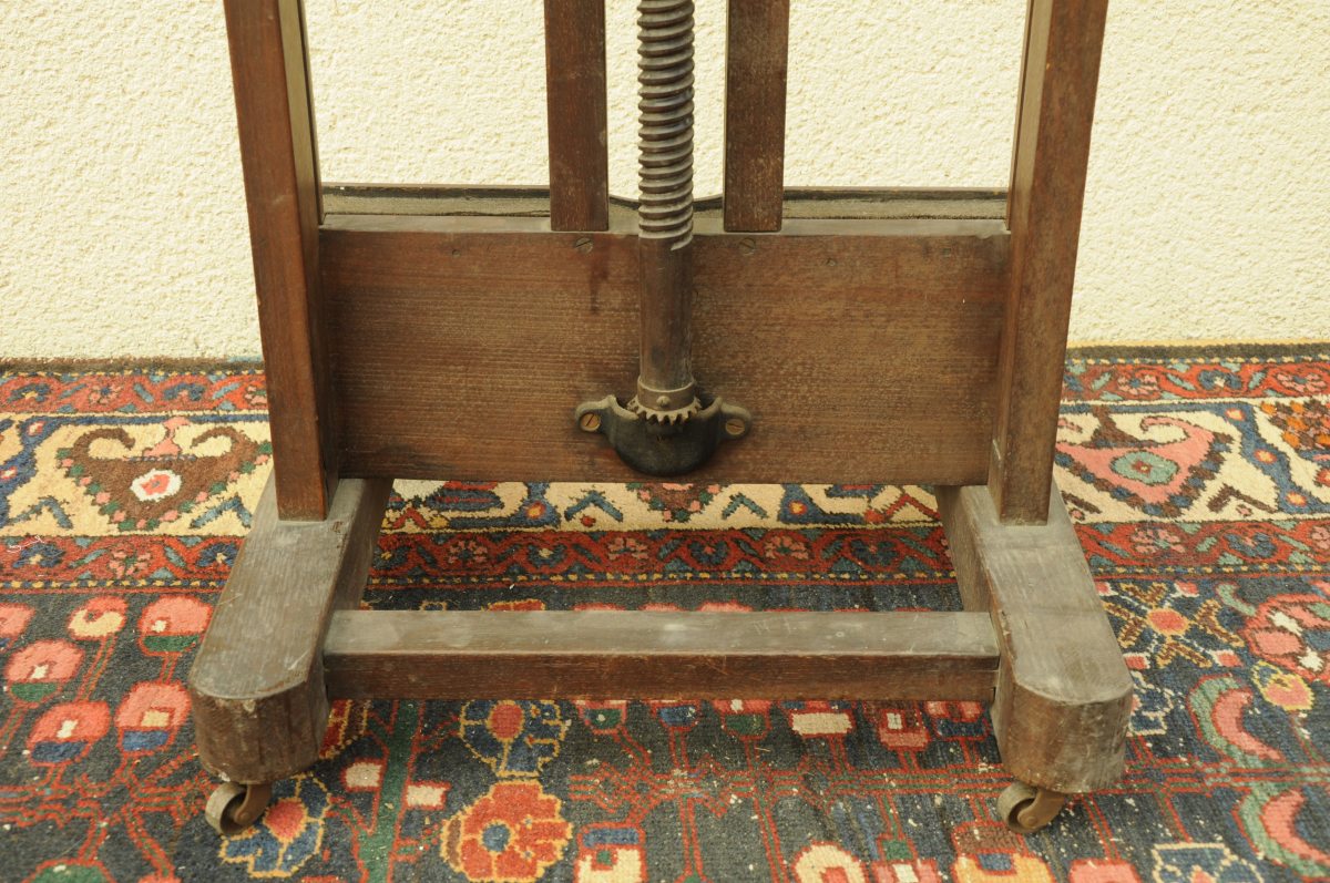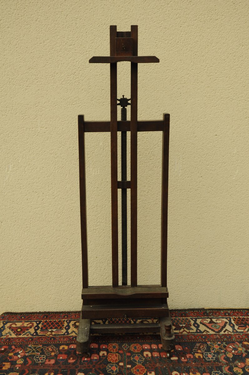 CHEVALET DE PEINTRE en chêne. Repose sur des roulettes. Vers 1900.