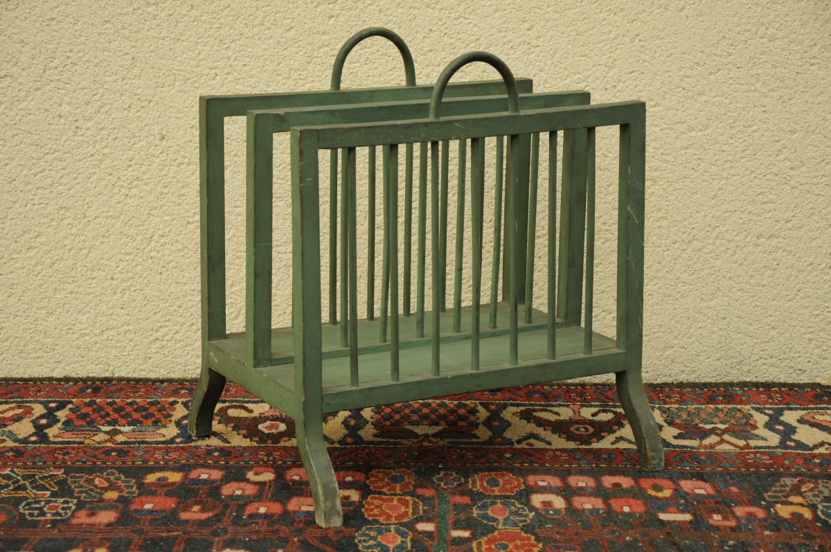 PORTE-REVUES à deux compartiments en bois patiné vert.