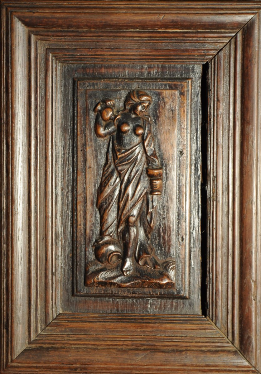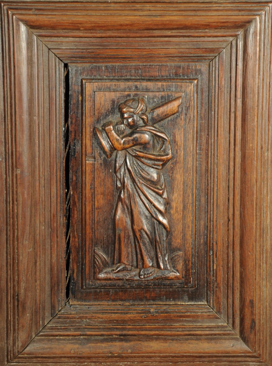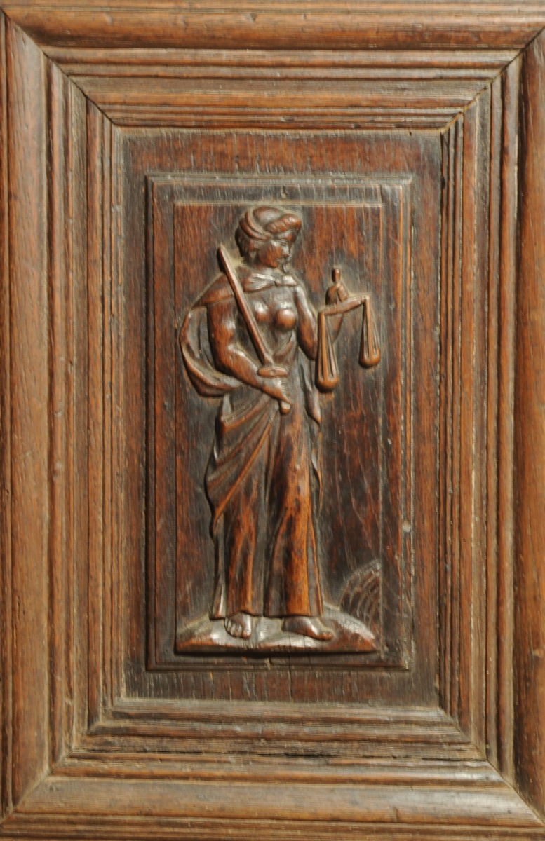 BUFFET à deux corps en chêne mouluré et sculpté. Il ouvre par quatre portes sculptées des vertus cardinales: la Prudence, la Tempérance, la Force et la Justice. Traverse supérieure, montants et encadrements de portes sculptés d'entrelacs. Côtés panneautés.