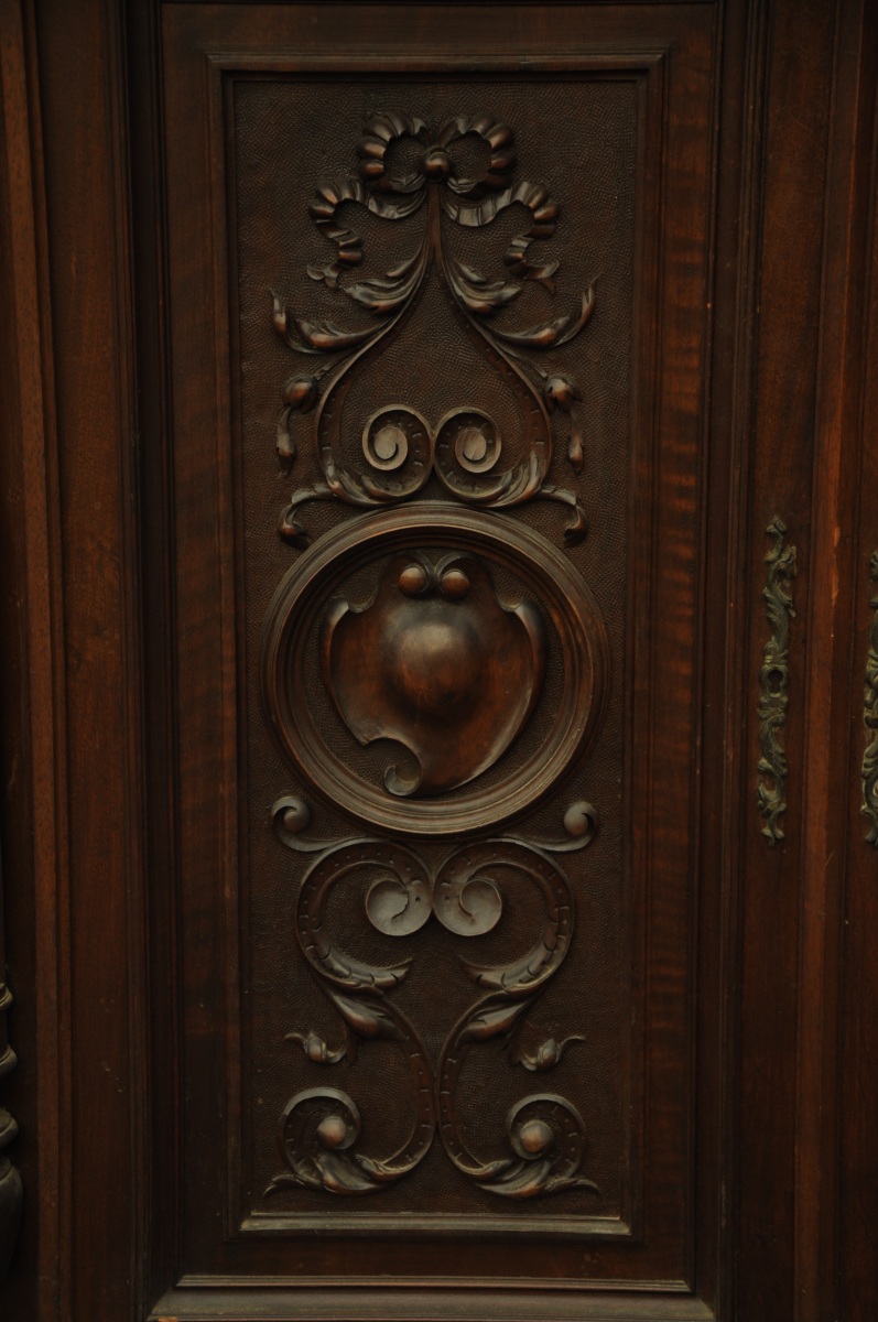 ENCOIGNURE en noyer formant vitrine en partie haute, ouvrant à un vantail à glace biseautée, flanqué de colonnes cannelées rudentées et l'intérieur foncé de glaces. La corniche sculptée d'une frise de roues dentelées et surmontée d'un fronton sculpté d'armoiries doubles, sommées d'une couronne tenues par des lions de chaque côté. La partie basse ouvrant à deux vantaux à motif de volutes feuillagées, nud de ruban et au centre un cartouche dans un médaillon. Plinthe moulurée à pans coupés reposant sur des boules aplaties.