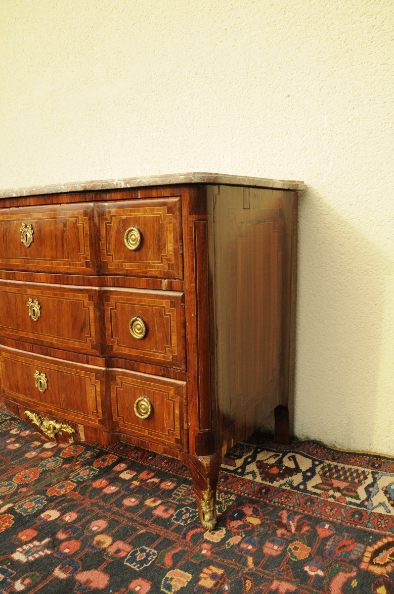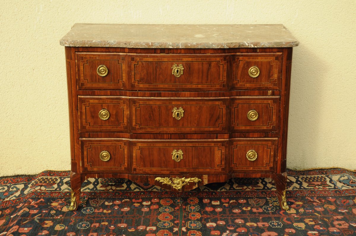 COMMODE à ressaut ouvrant par trois tiroirs. Bois de rose et de violette en placage et filets d'encadrement. Entrées de serrures à noeuds de rubans et poignées mobiles en bronze doré. Montants arrondis, petits pieds cambrés à sabots de bronze. Tablier avec cul de lampe orné d'une coquille rocaille. Dessus de marbre rose veiné.