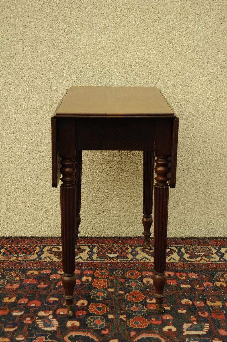 Petite TABLE à abattants en acajou, à pieds tournés, montés sur des roulettes. Elle ouvre par un tiroir en ceinture sur le côté.