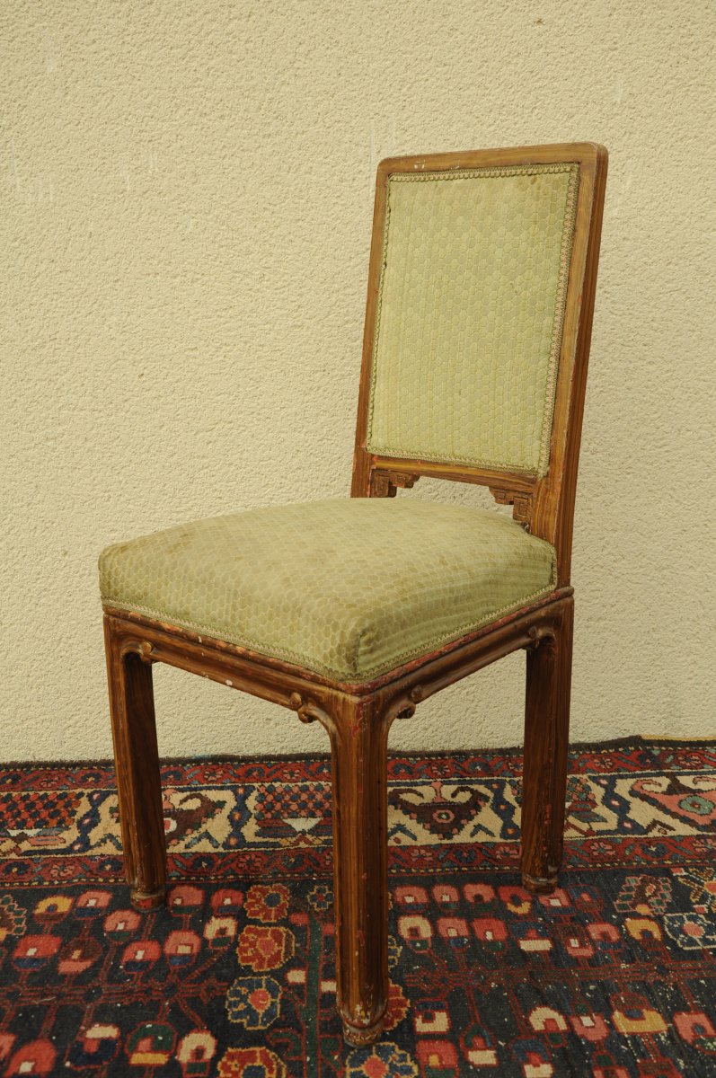 Jointe: CHAISE en bois peint, à dossier droit. Haut. 89, Larg. 42, Prof. 45 cm.