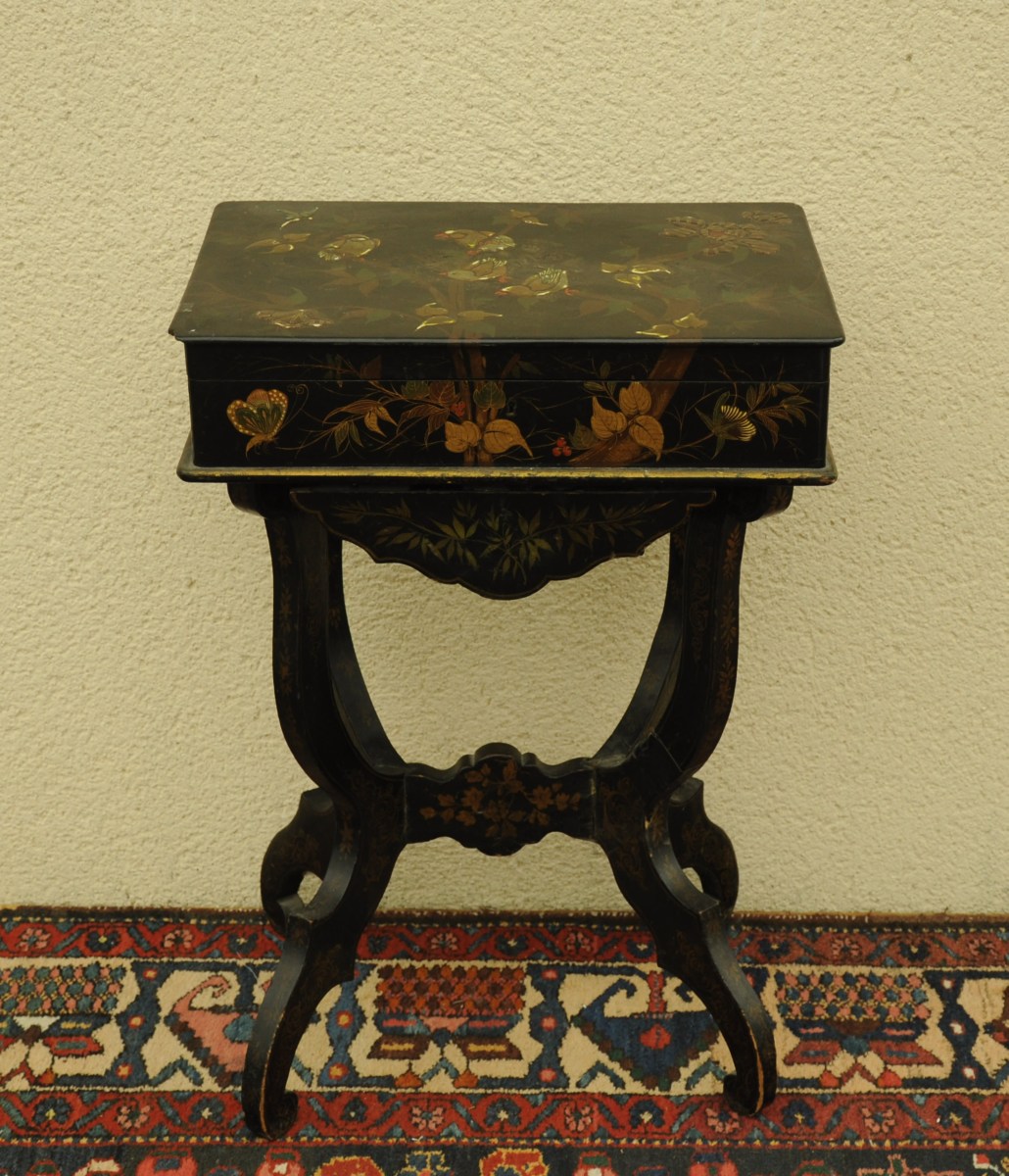 TABLE à OUVRAGE de style chinois en bois laqué noir, à décor vert, rouge et doré d'insectes et d'oiseaux dans des branchages. Elle repose sur quatre pieds chantournés et ouvre par un tiroir et un abattant, découvrant des compartiments garnis de tissu rose.