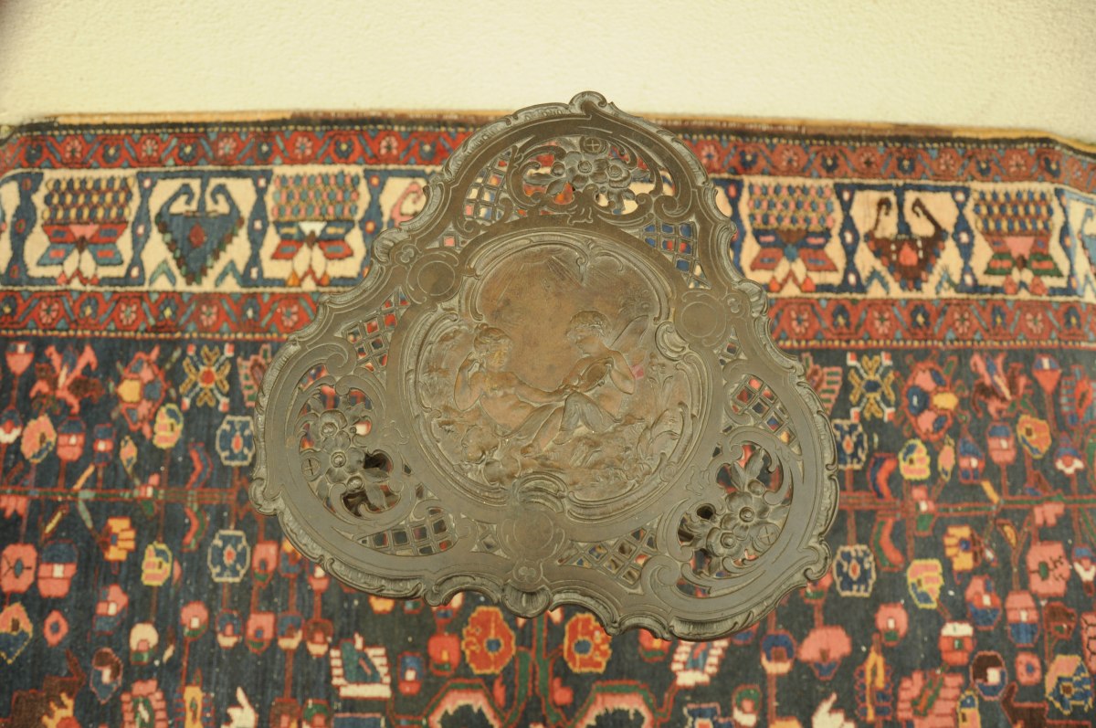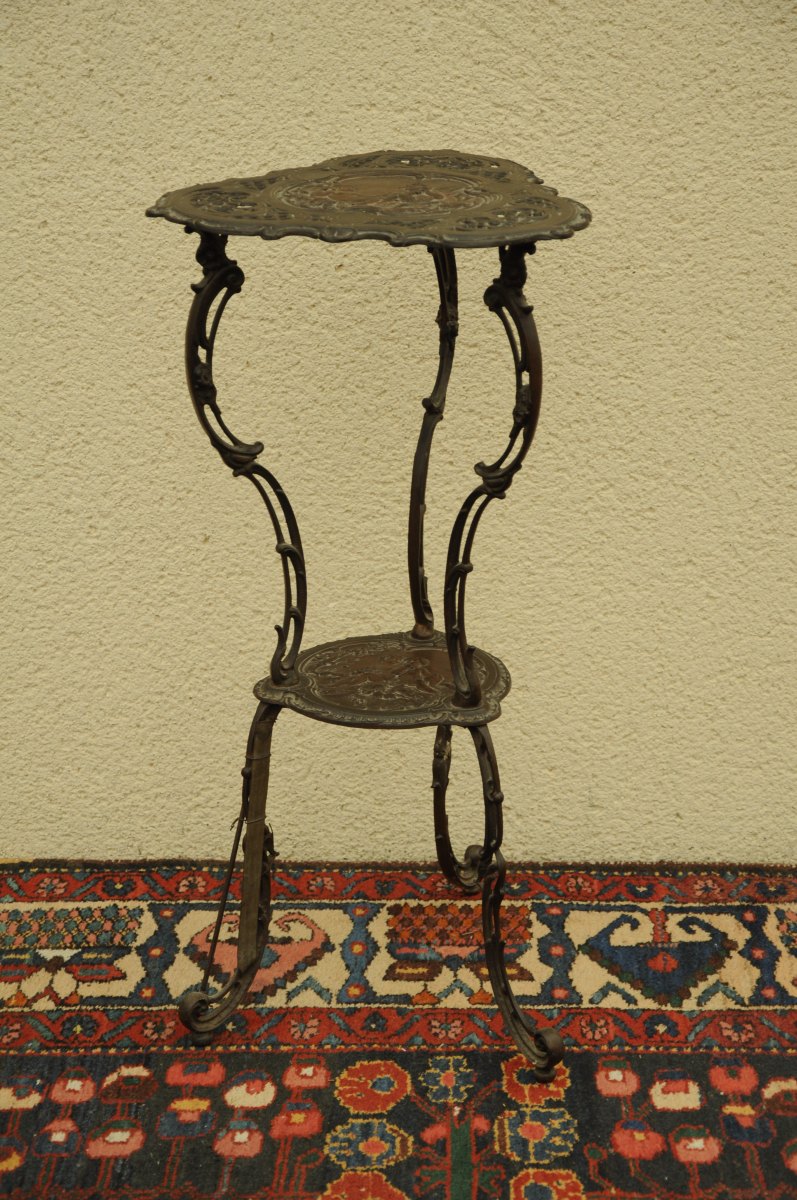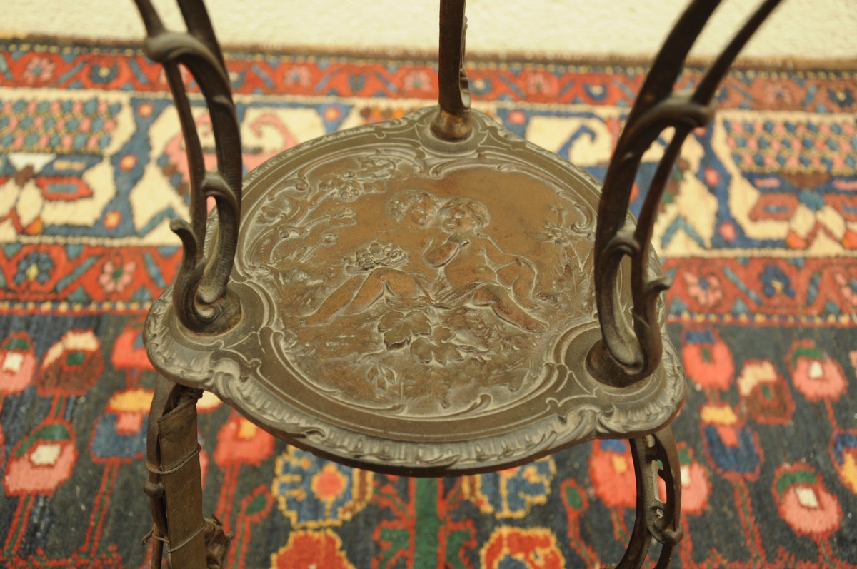 GUÉRIDON tripode en métal patiné (fonte de fer?). Plateau et entrejambe mouvementés. Décor de putti dans l'esprit Rocaille. Marques.
