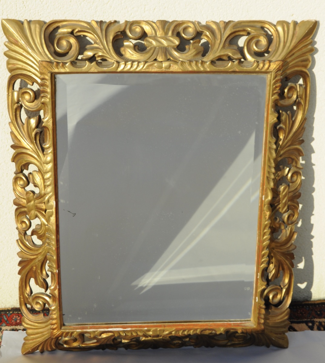 MIROIR en bois sculpté et doré. Décor ajouré de palmes s'enroulant en volutes. Glace biseautée.