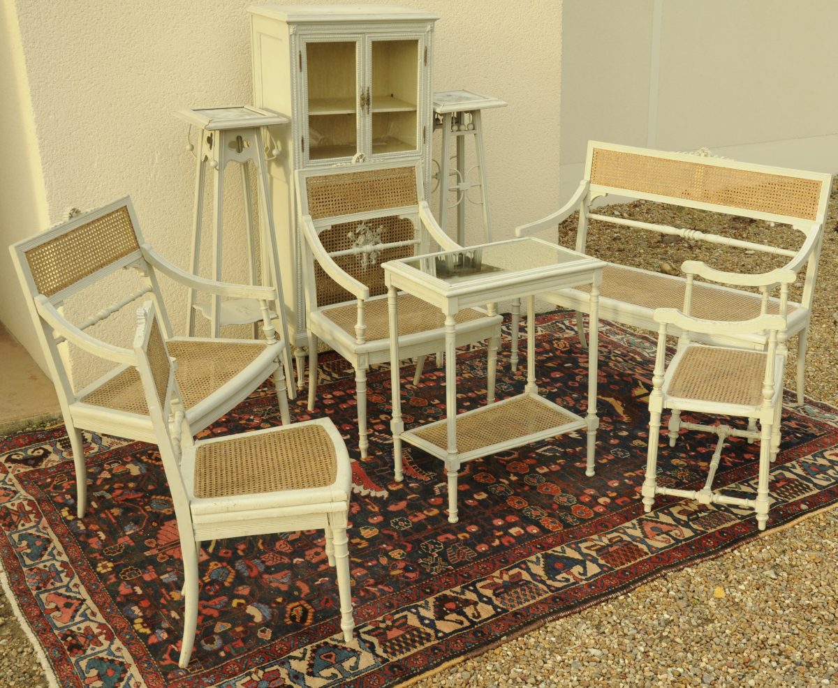 MOBILIER de SALON comprenant 9 pièces, en bois peint en blanc: une banquette, un tabouret, deux sellettes, deux fauteuils à dossiers droits, une chaise, une table à deux plateaux et une petite armoire formant vitrine.