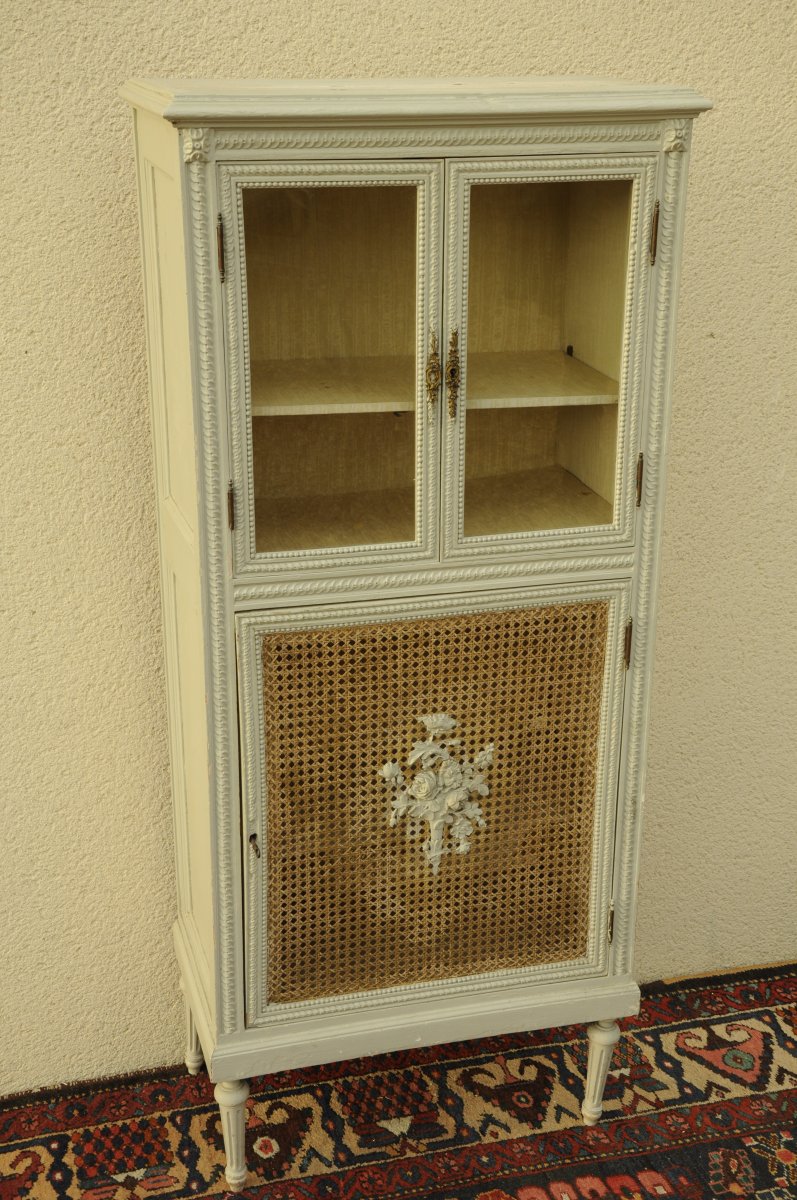La petite armoire ouvre en partie inférieure par une porte foncée de canne et ornée d'un bouquet de fleurs en stuc. La partie supérieure ouvre par deux portes vitrées.