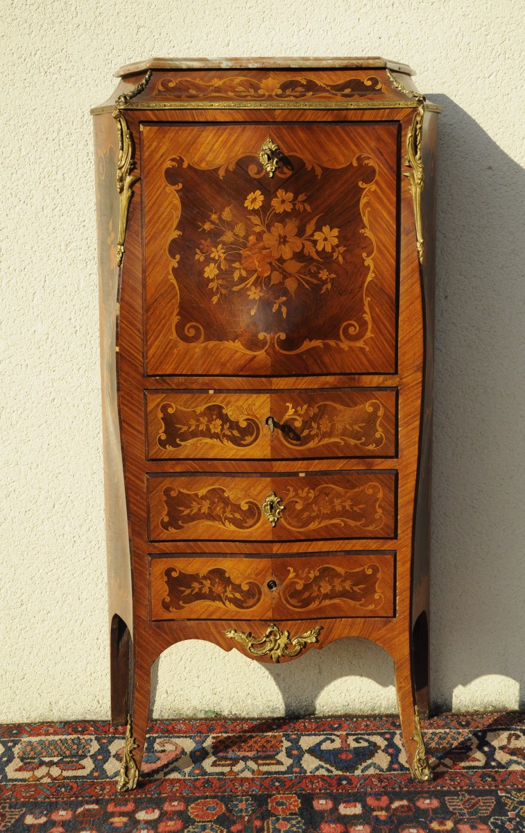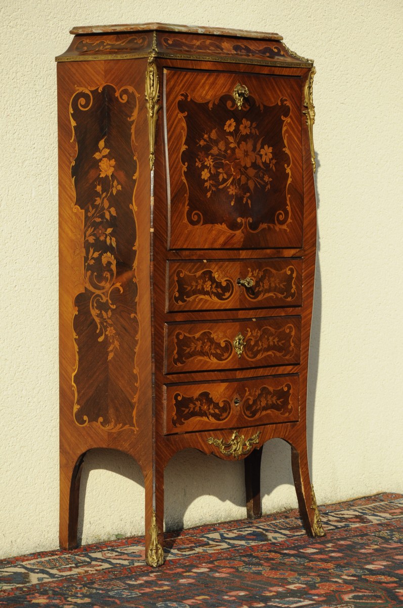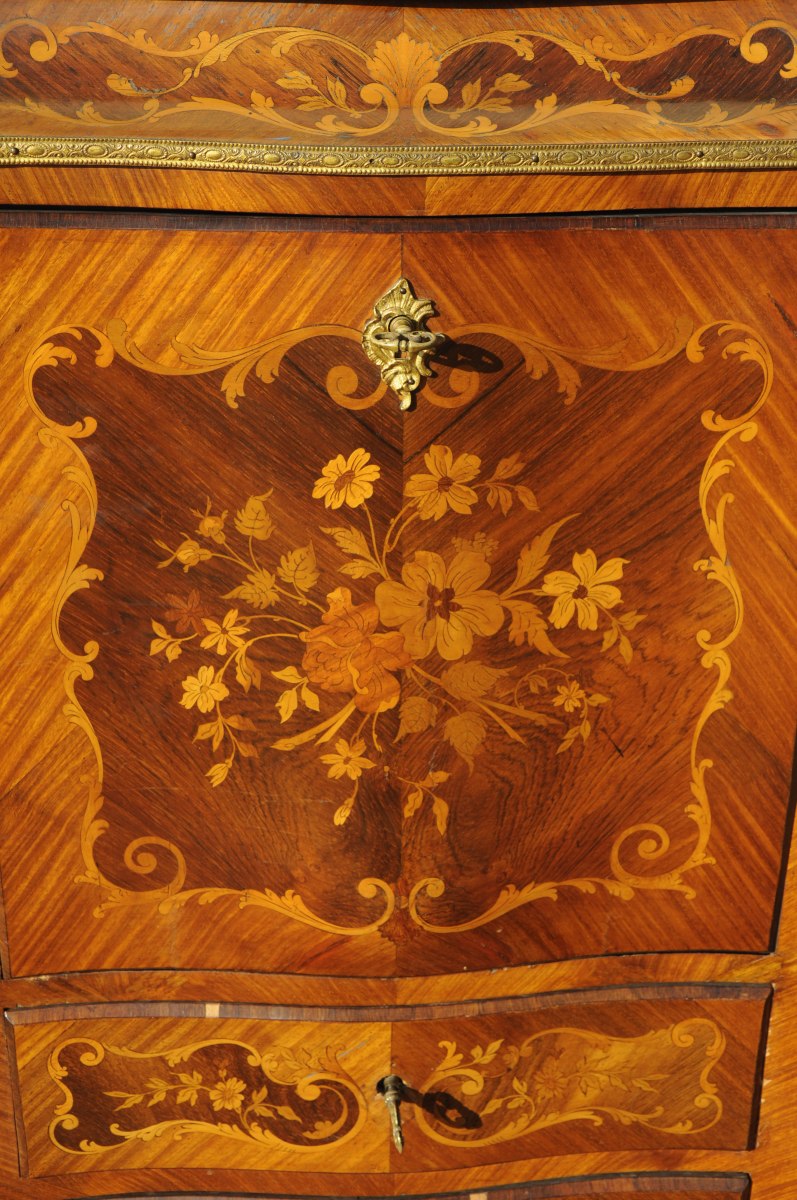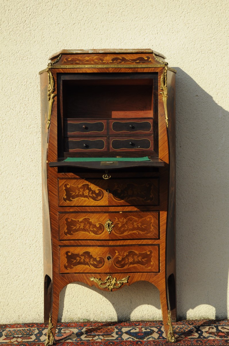 SECRÉTAIRE à abattant galbé sur trois faces et reposant sur des pieds cambrés. Il ouvre par trois tiroirs en partie inférieure. L'abattant découvre un grand tiroir et deux plus petits. Partie supérieure à doucine. Beau décor de marqueterie florale sur fond de placage de bois de violette et encadrements de bois de rose. Ornementation de bronzes dorés, tels que chutes d'angles, entrées de serrure et sabots.