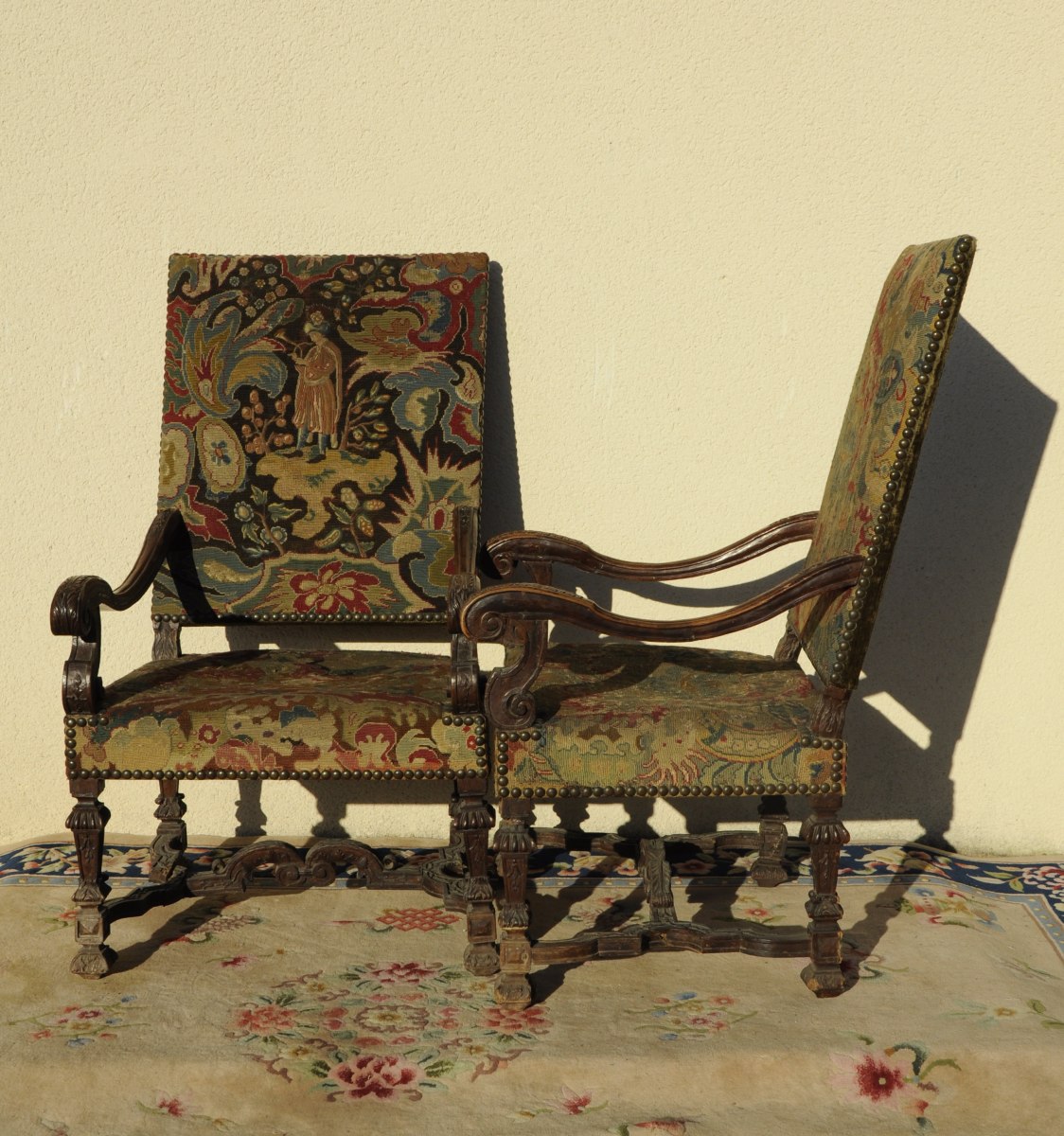 PAIRE de FAUTEUILS en noyer mouluré et sculpté, à hauts dossiers. Accotoirs et consoles d'accotoirs à volutes. Pieds gaines réunis par une entretoise. Riche décor sculpté de feuilles d'acanthe et de lambrequins.