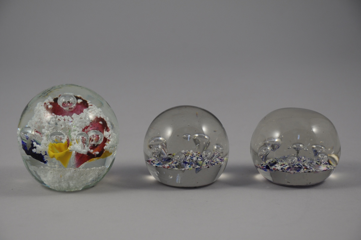 Trois PRESSE-PAPIERS SULFURES en verre avec bulles et inclusions multicolores.