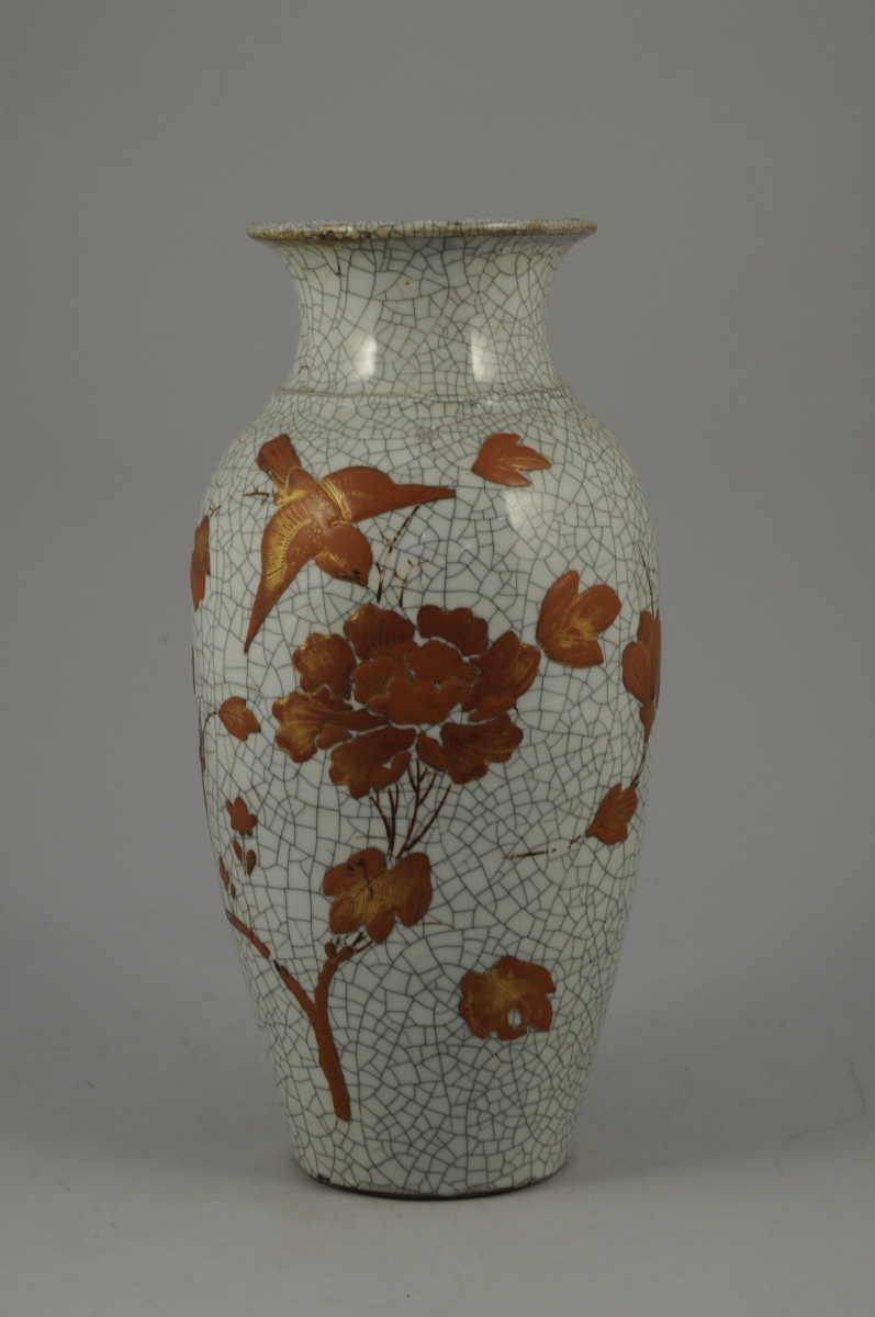 VASE balustre en céramique à couverte blanche craquelée, à décor d'un oiseau et de papillons volants dans des branchages fleuris. XXème.