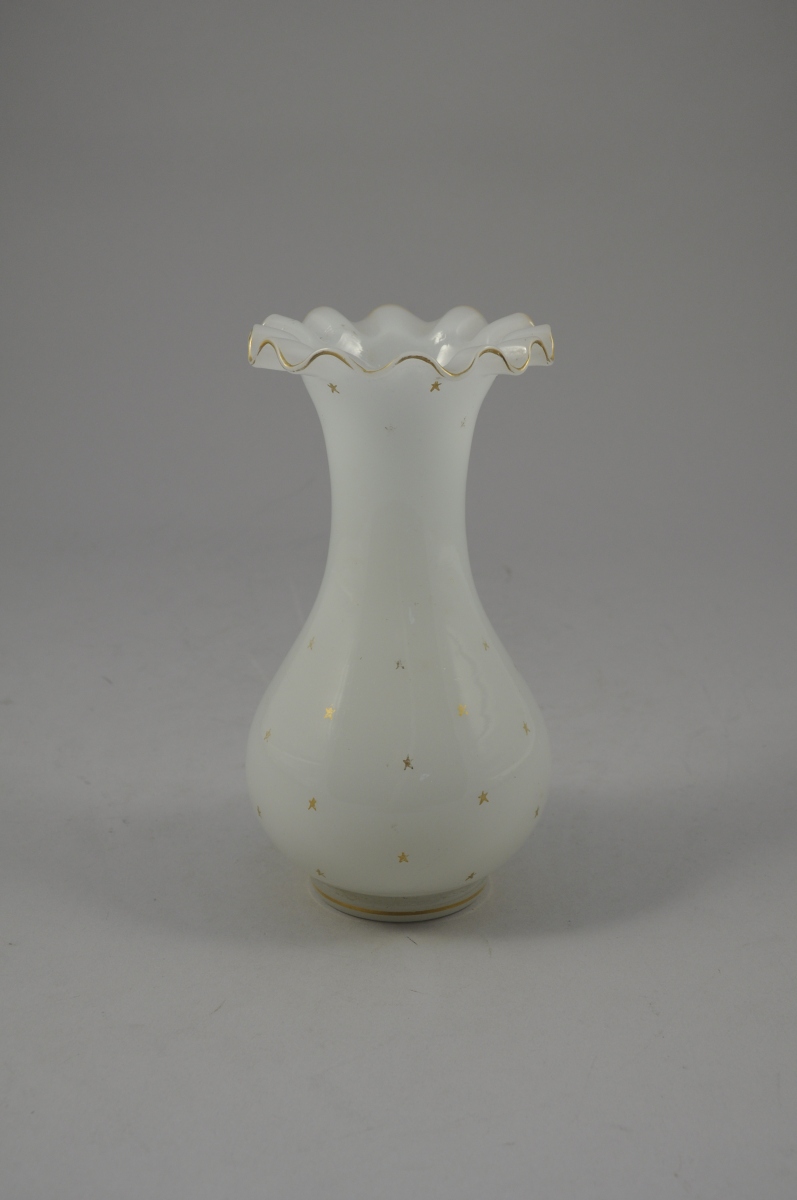 VASE balustre à col ourlé, en verre opalescent blanc, à décor de petites étoiles et filets dorés.