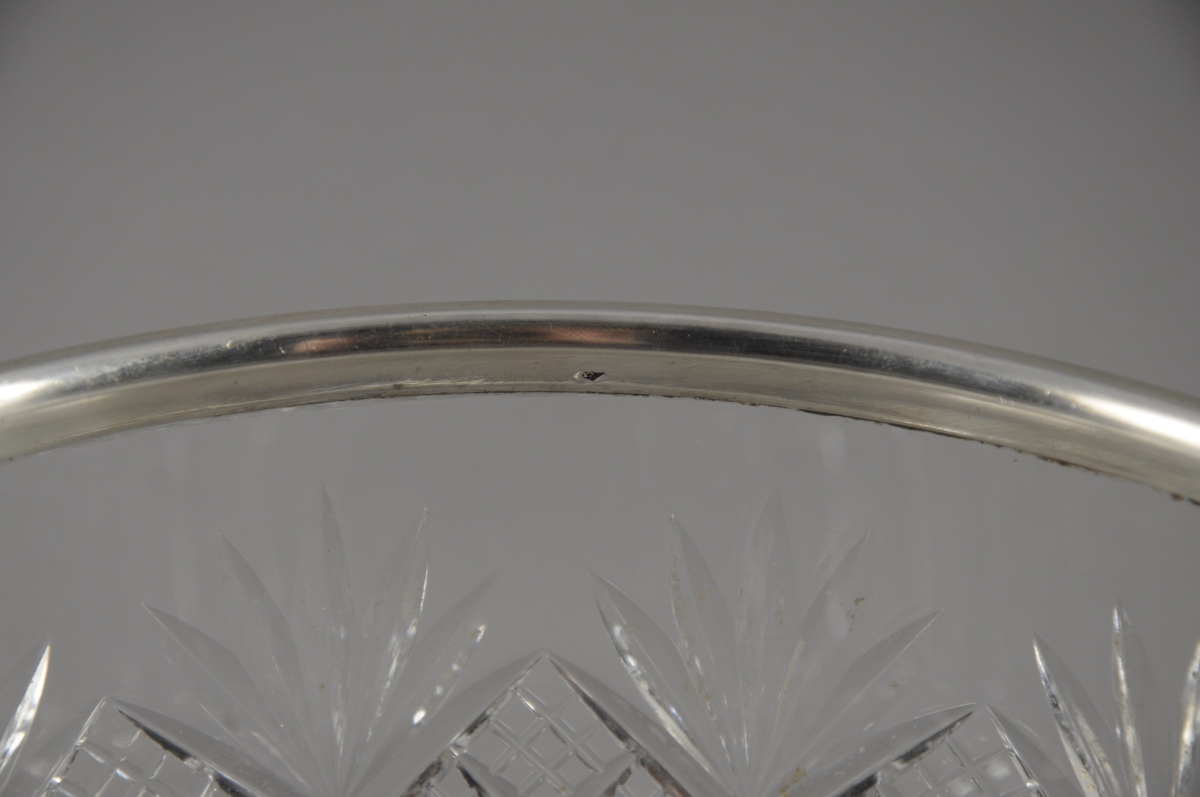 JATTE circulaire en cristal taillé à la main à décor de pointes de diamant. Jonc argent enrubanné à feuilles de chêne. Diam. 25, haut. 11 cm.