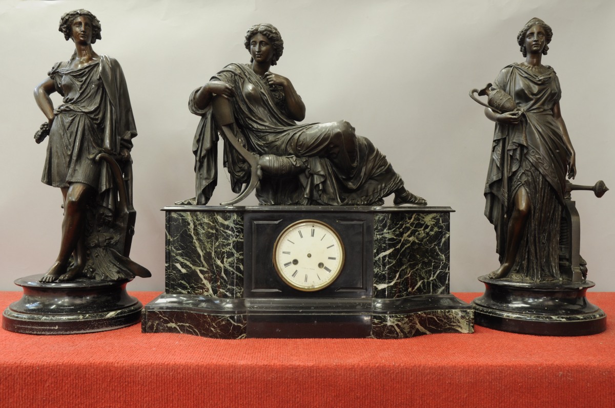 GARNITURE de CHEMINÉE en marbre noir, marbre veiné vert et régule. Pendule à cadran émaillé blanc indiquant les heures en chiffres romains et marquée "Oudry à Paris". Elle est ornée en partie supérieure d'une figure de femme assise, drapée à l'antique. Les statues sur socles ronds de marbre figurent l'Agriculture, avec des gerbes de blé, et l'Industrie, avec une presse d'imprimerie.