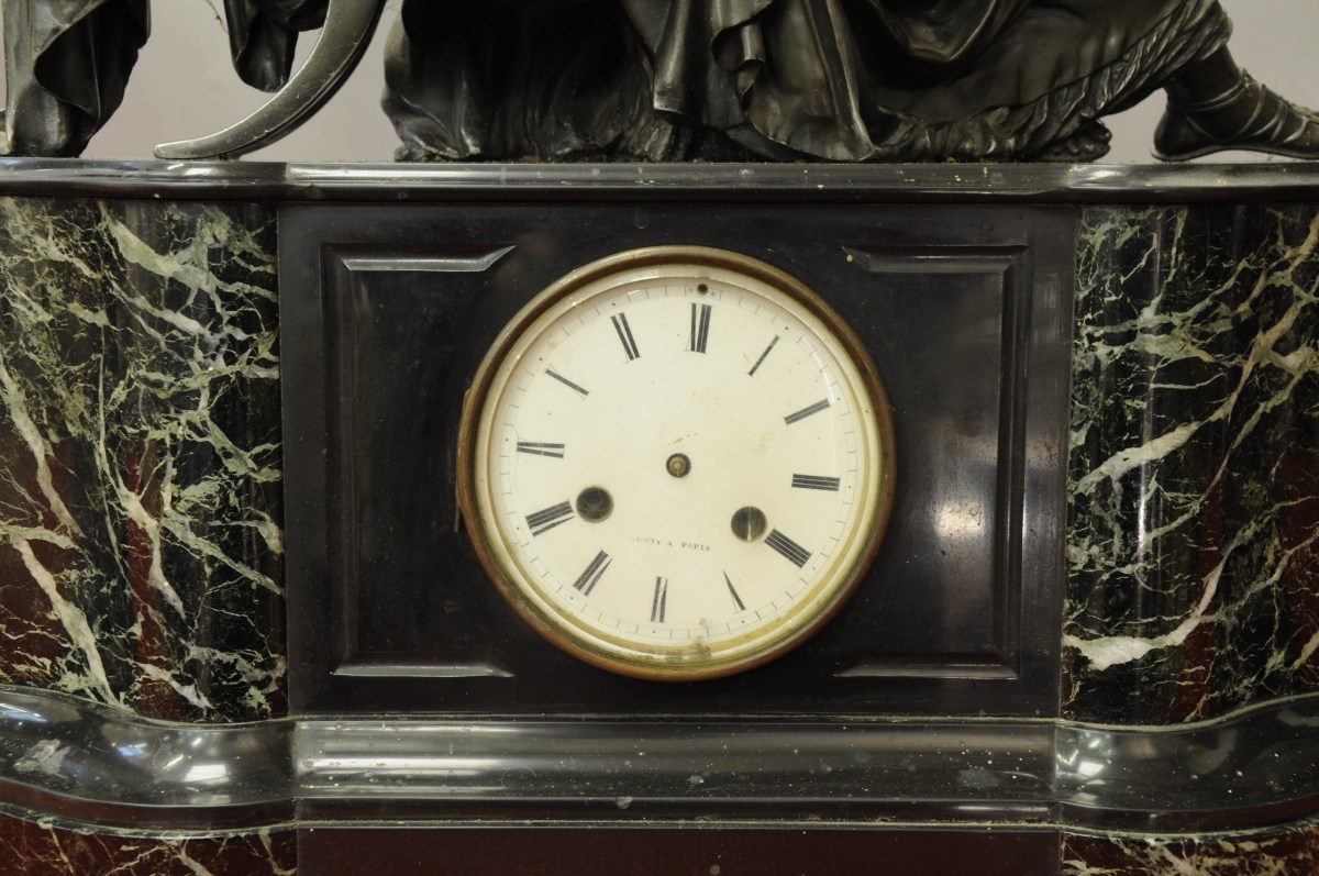 Pendule. Haut. 53, Larg. 55, Prof. 20 cm. Statues. Haut. 55cm. (manques, accidents)