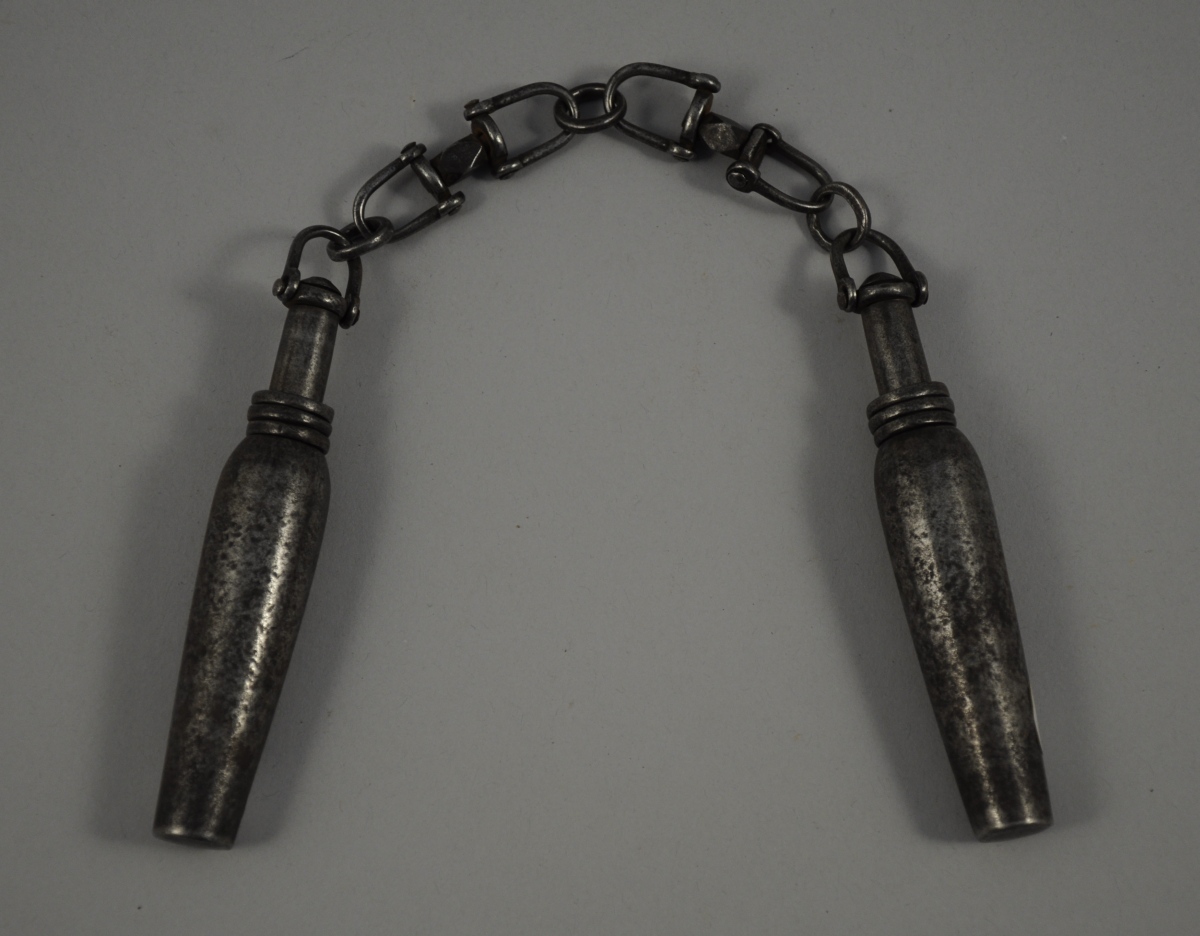 Deux éléments en fer solidarisés par une chaîne à maillons en étrier.