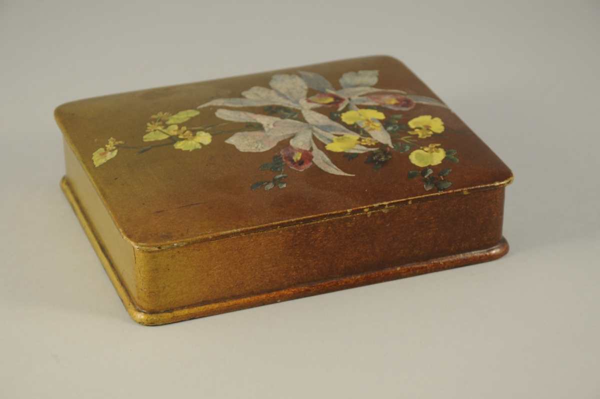 BOÎTE en carton bouilli à décor à l'imitation de la Chine de fleurs imprimées et contrecollées sur le vernis.