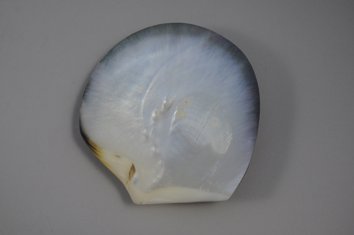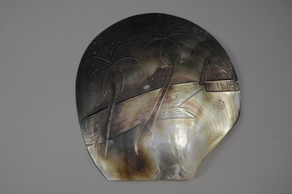 COQUILLAGE gravé à décor d'une paillotte au bord de la mer.