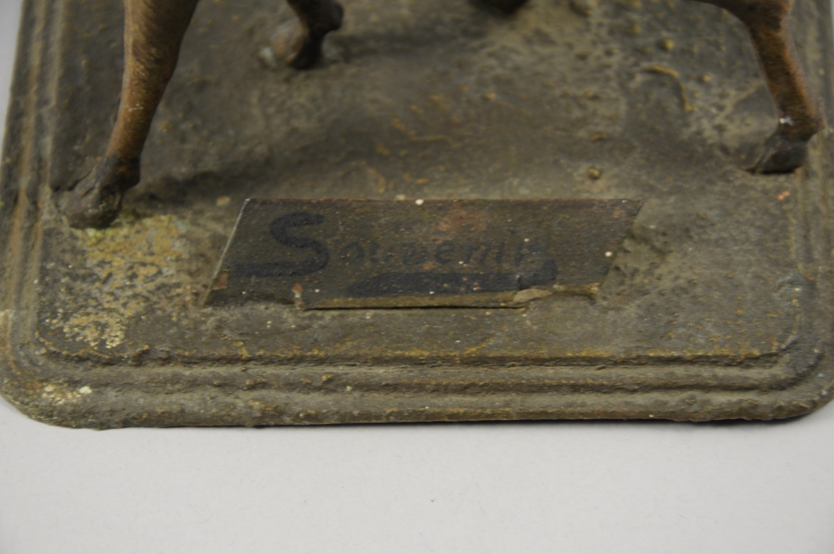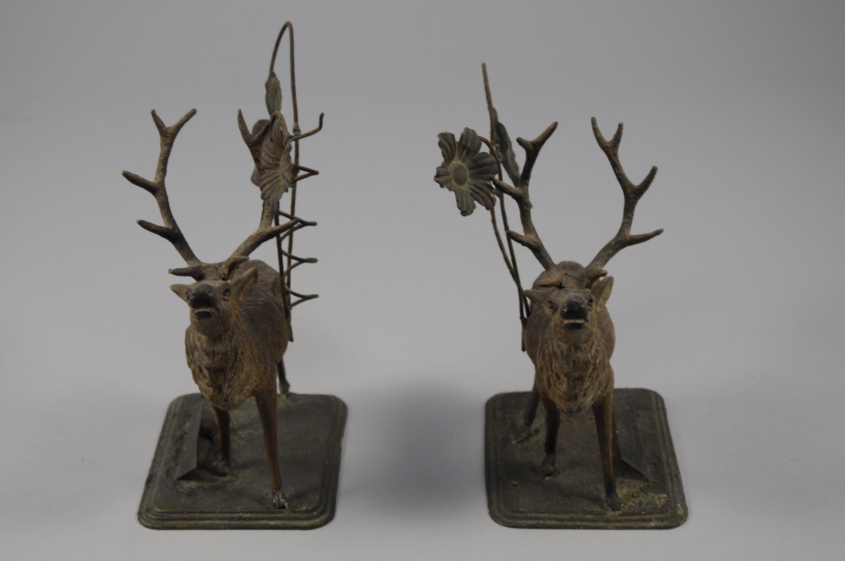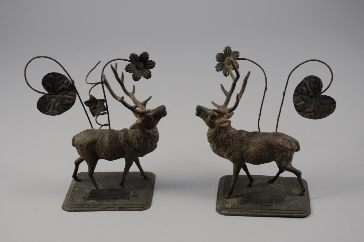 PAIRE de CERFS flanqués de fleurs en tôle peinte. Portent un cartel inscrit "Souvenir".
