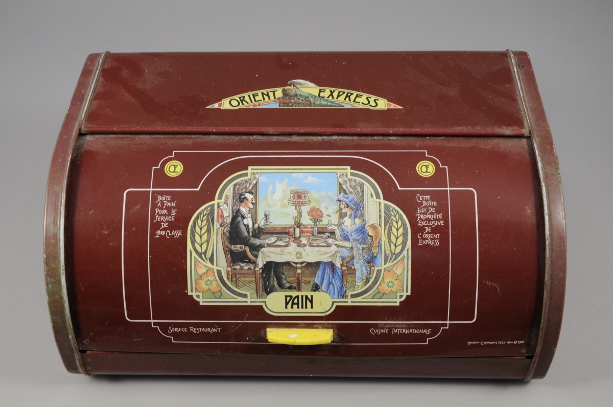 BOITE à PAIN en tôle peinte"Orient-Express". Décor d'un couple en habit du soir dînant dans le train sur fond de couleur " lie de vin ".