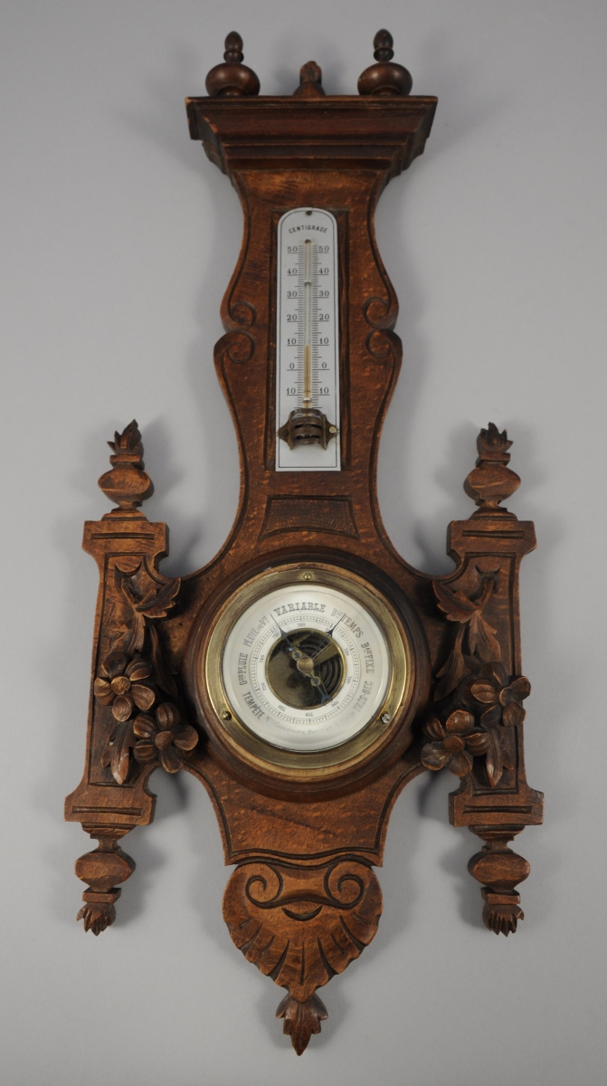 BAROMÈTRE THERMOMÈTRE en bois sculpté, le cadran marqué "Vve Guernier, opticien à Caen".