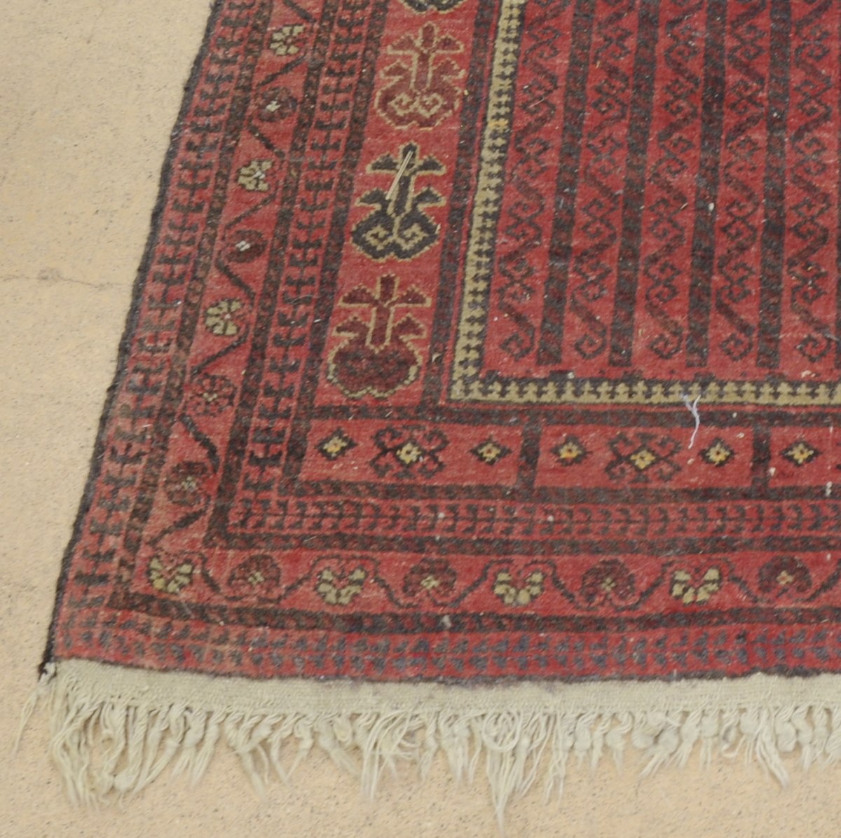 TAPIS d'Orient dit de prière en laine à points noués à décor d'un mirhab, sur fond rouge, à bordures multiples. 85 x 141 cm.