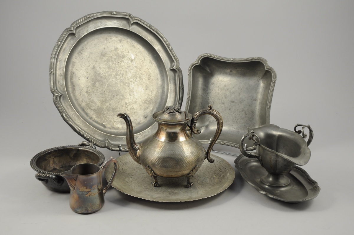 -Une saucière, un plat rond et un compotier en métal à décor de joncs rubannés.