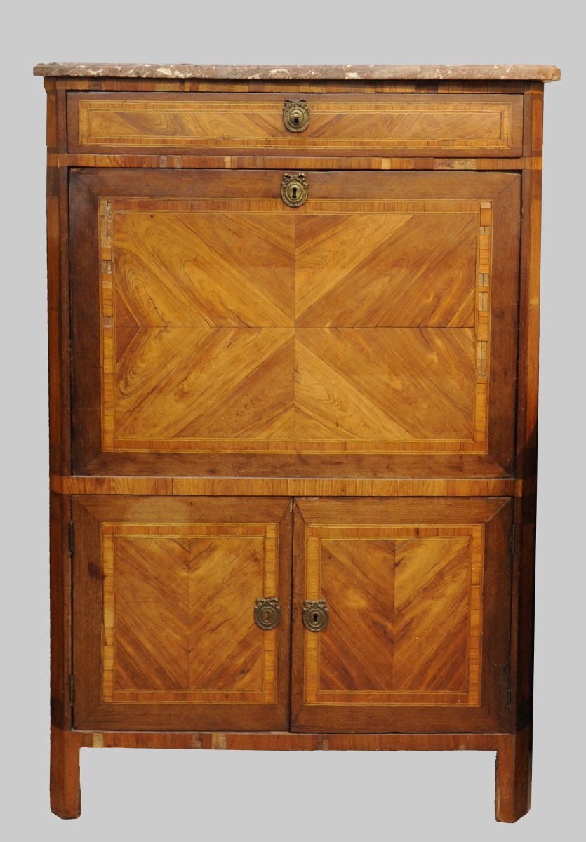 SECRÉTAIRE en bois de placage et filets de bois clair ouvrant par un tiroir, deux vantaux et un abattant découvrant quatre casiers et six tiroirs, les montants à pans coupés. Dessus de marbre rouge de Bourgogne.
