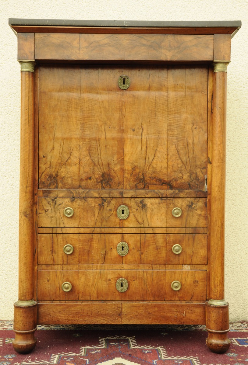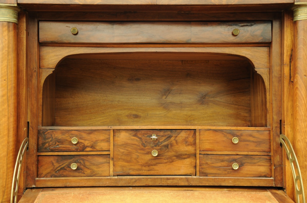 SECRÉTAIRE en noyer et placage de noyer. Il ouvre par quatre tiroirs et un abattant. Ce dernier, foncé de cuir marron à bordure dorée, découvre un intérieur garni d'une niche et de six tiroirs. En façade, deux colonnes détachées reposant sur des pieds ronds.